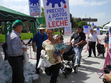 La concentración de ganaderos, que portaban pancartas con el lema “Precios Justos para la Leche”, comenzó a las 12 horas, y se completó con el reparto de 2.500 litros de leche de explotaciones de Castilla y León, que se han ido distribuyendo entre cientos de vecinos de la capital que se han acercado a la explanada de la Plaza del Milenio para recoger el producto. Muchos de ellos se interesaban por las demandas de los ganaderos, que les explicaban cómo en apenas un año han pasado del de cobrar cerca de 36 céntimos por litro a los apenas 29 actuales, “lo que significa que cada día se pierde en una granja de tamaño medio cerca de cien euros, es decir, 3.000 euros mensuales que desaparecen, lo que dinamita cualquier posibilidad de ser rentable”, señaló Dujo.