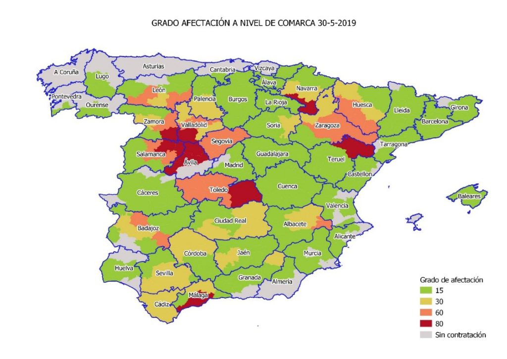 Por zonas productoras, la zona sur de Castilla y León y de Navarra, y las comunidades de Aragón y Madrid son las más afectadas, así como algunas zonas de las provincias de Málaga y Toledo. Le siguen en menor proporción de daños el resto de Castilla – La Mancha, Extremadura y Andalucía.