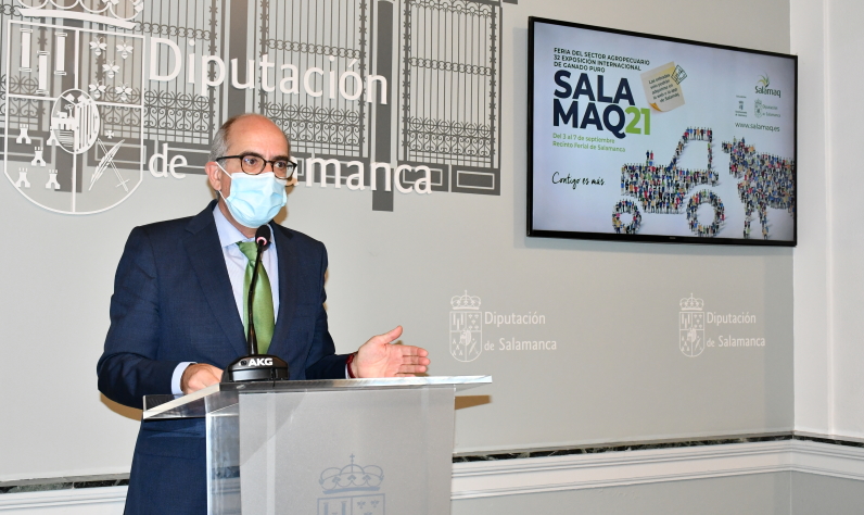 El presidente de la Diputación, que estuvo acompañado en el acto de presentación por los diputados de Ferias, Jesús María Ortiz, de Agricultura y Ganadería, Julián Barrera, y de Servicios Generales, Marcelino Cordero, señaló que Salamaq 21 será inaugurada el día 3 por el presidente de la Junta de Castilla y León, Alfonso Fernández Mañueco, en un acto que contará también con la presencia del Ministro de Agricultura, Alimentación y Medioambiente, Luis Planas.