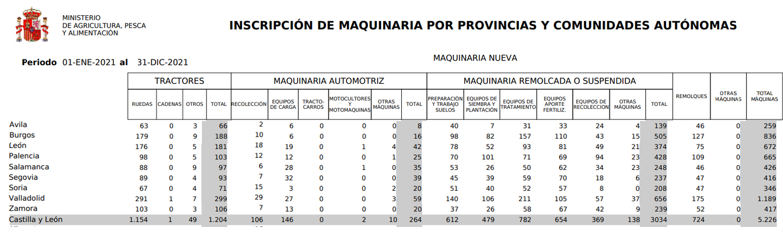 La inscripción de maquinaria nueva en la provincia de Salamanca ha registrado en 2021 una bajada de una 4’69 % con respecto al año anterior, según los datos ofrecidos por el Ministerio de Agricultura Pesca y Alimentación. Además es la única provincia que disminuye en Castilla y León. Los datos provinciales muestran este descenso al contabilizar 426 máquinas nuevas el año pasado, cuando en 2020 se inscribieron 447.
