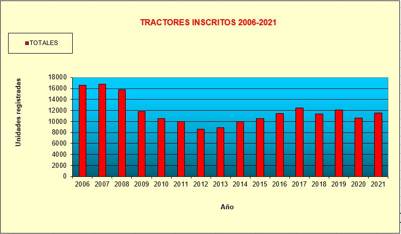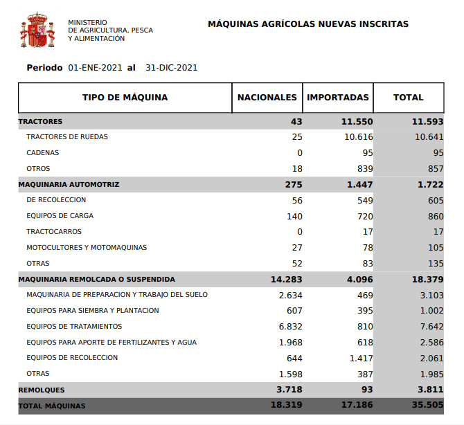 El número de maquinaria agrícola nueva registrada en el año 2021 en España creció un 10’46 % con respecto a 2020 y alcanzó una cifra global de 35.505 unidades. La inversión realizada fue de 1.209’7 millones de euros, según constata el informe anual de los Registros Oficiales de Maquinaria Agrícola (ROMA) que elabora el Ministerio de Agricultura, Pesca y Alimentación. Los datos de 2021 muestran un ascenso en la inscripción de todos los tipos de máquinas nuevas, a excepción de la maquinaria automotriz, en la que se produjo un ligero descenso de 3’48 %.