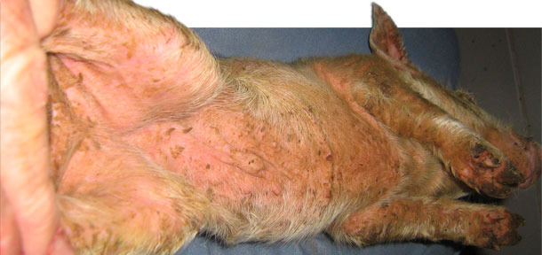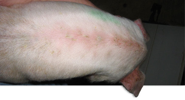 Esta patología es más dramática en animales nacidos de cerdas no inmunes. Los traumatismos cutáneos producidos por peleas, corte de dientes o suelos o camas abrasivas pueden traspasar las capas protectoras de la piel. Las lesiones de la EE están asociadas a las toxinas exfoliativas termolábiles producidas por S. hyicus. Los cambios en la piel están acompañados por un aumento de la secreción sebácea y un exudado seroso. La mortalidad asociada a la EE está básicamente relacionada con la deshidratación, aunque también pueden producirse septicemia y artritis.