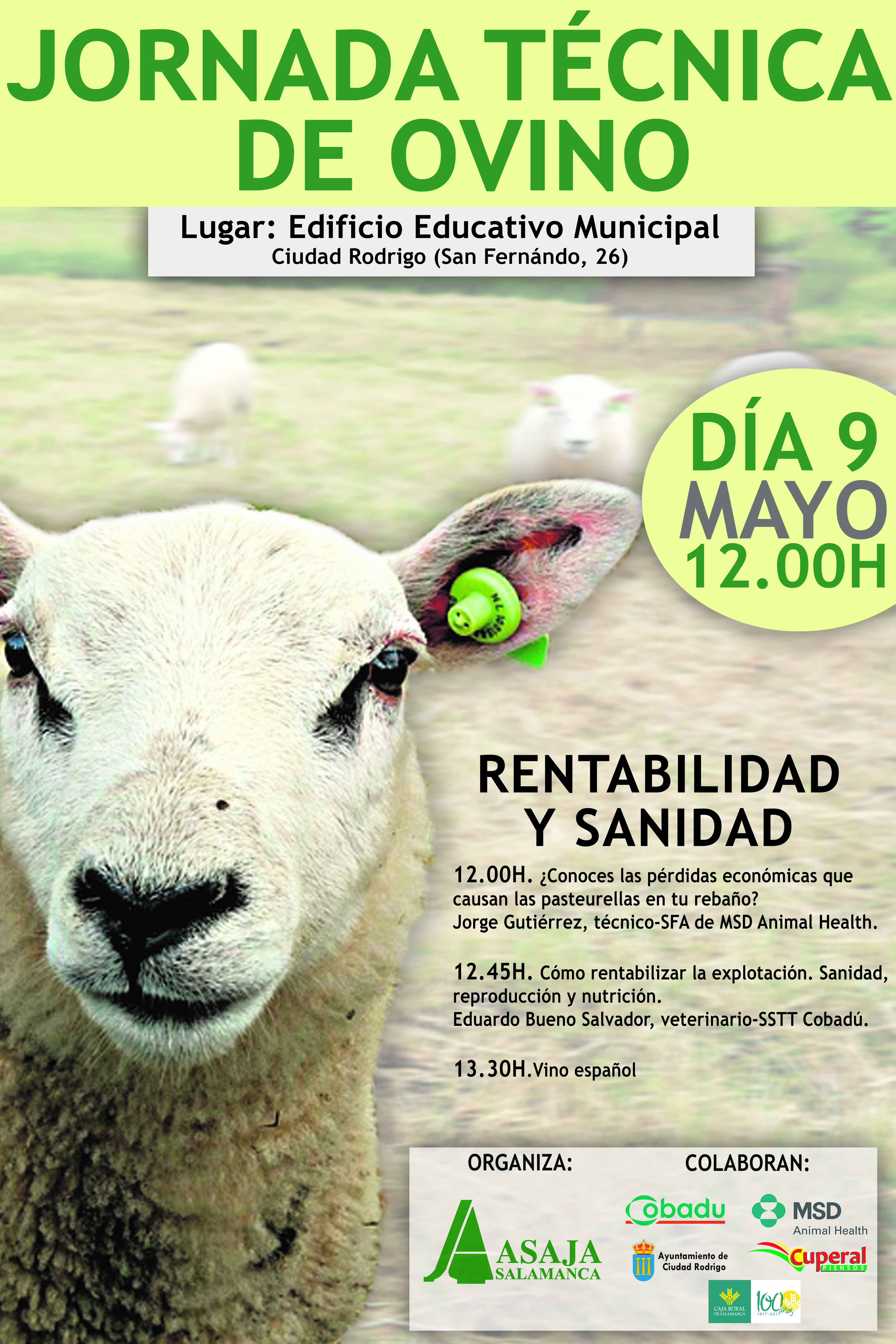 ASAJA Salamanca organiza una jornada de ovino que se desarrollará en la localidad salmantina de Ciudad Rodrigo el próximo 9 de mayo a las 12 horas y en la sala del Edificio Educativo Municipal (calle San Fernando, 26). Se contará con expertos de la talla del técnico-SFA de laboratorios MSD Animal Health, Jorge Gutiérrez, y el veterinario-SSTT de Cobadú, Eduardo bueno Salvador, que nos ilustrarán sobre las piezas claves para mejorar las explotaciones de ovino en Salamanca, bajo un recorrido por los tres pilares fundamentales: nutrición, reproducción y sanidad; además de ofrecer luz para poder mitigar los efectos negativos que causan pérdidas económicas en los rebaños como son las pasteurellas.