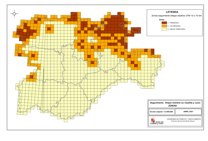 Se actualiza, así, la zonificación para la ejecución de las actuaciones de trampeo, tras la finalización de los periodos de trampeo de reinas de primavera y de otoño y con los datos de presencia de la especie más actualizados en relación a detección de nidos primarios, secundarios y/o ejemplares de la especie, a partir de la información obtenida de la red de monitoreo y centinelaje de la Consejería de Agricultura y Ganadería.