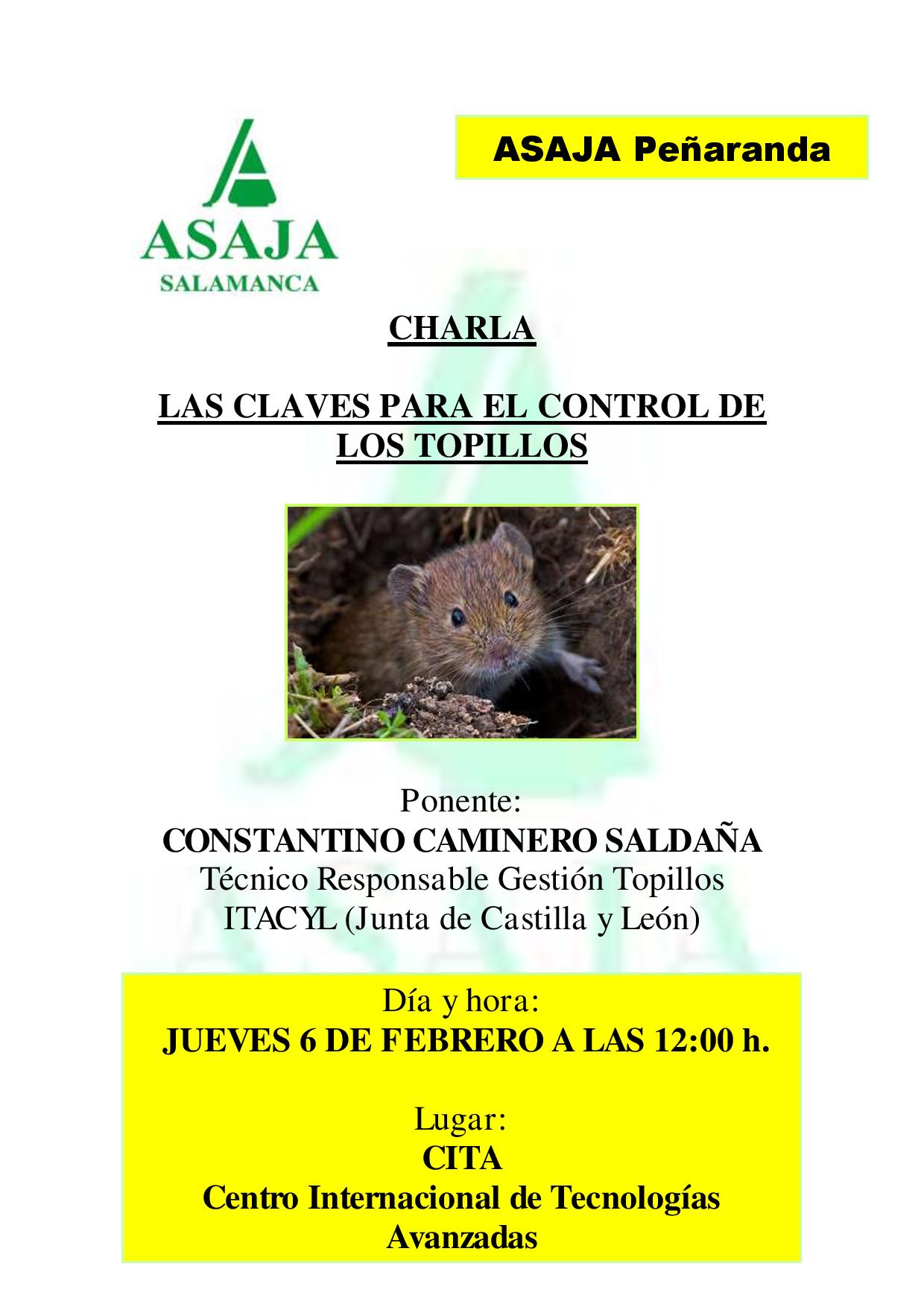 ASAJA Salamanca, en colaboración con el ITACyL, ha organizado para el próximo 6 de febrero, en el CITA -Centro Internacional de Tecnologías Avanzadas- de Peñaranda de Bracamonte, una charla informativa sobre el estado actual de la plaga de topillos en la comarca de Peñaranda y las medidas que se plantea realizar la Junta de Castilla y León en las próximas semanas para acabar con este roedor, como son las labores en profundidad, volteo de cunetas y linderos, o la posible aplicación de veneno para controlar la plaga.