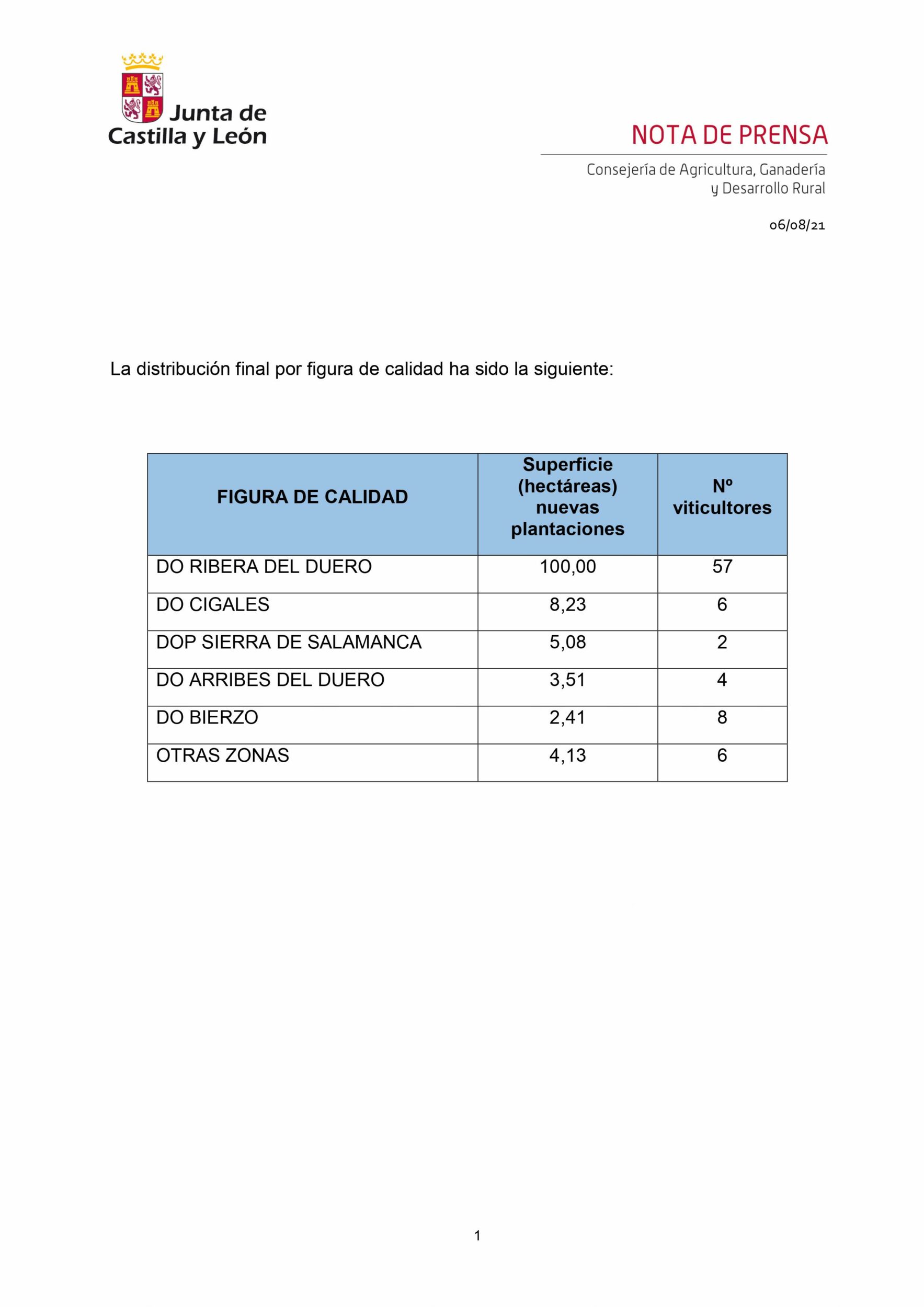 La Consejería de Agricultura, Ganadería y Desarrollo Rural ha comunicado a los 83 viticultores las 123,36 hectáreas autorizadas para nuevas plantaciones de viñedo en 2021. Castilla y León ha recibido el 13 % de la superficie concedida a nivel nacional, siendo la segunda Comunidad en superficie autorizada por detrás de Castilla-La Mancha.