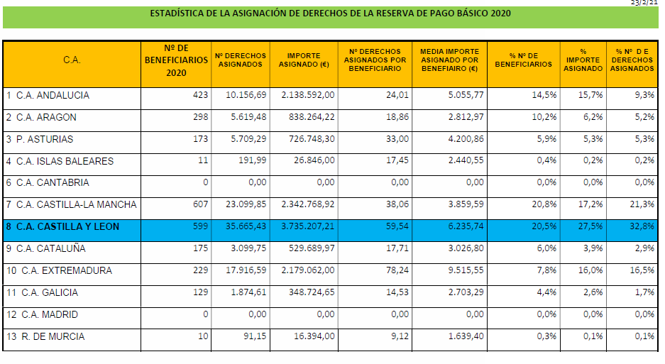 Según los datos enviados por las comunidades autónomas a la base de datos de gestión de derechos de pago básico del FEGA, a fecha de cálculo de asignación de derechos de la reserva nacional, la distribución de beneficiarios e importe por Comunidad Autónoma se adjunta en un cuadro.