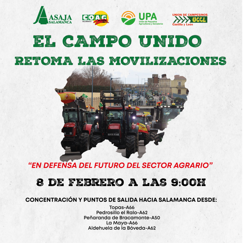 Se convoca con un gran acto de protesta conjunto, en la provincia de Salamanca, que tendrá lugar el jueves 8 de febrero., y que consistirá en una tractorada que partiendo de cinco puntos estratégicos de la provincia (Topas – A66, Pedrosillo el Ralo – A62, Peñaranda de Bracamonte – A50, La Maya – A66, Aldehuela de la Bóveda – A62), se dirigirá en diversas columnas hacia la capital y Una vez congregados en Salamanca, se procederá a circular de forma ininterrumpida por la A-62 en el tramo que une el enlace de la N-630 en la rotonda del Helmántico, con el enlace de la N620 en la rotonda de Buenos Aires.