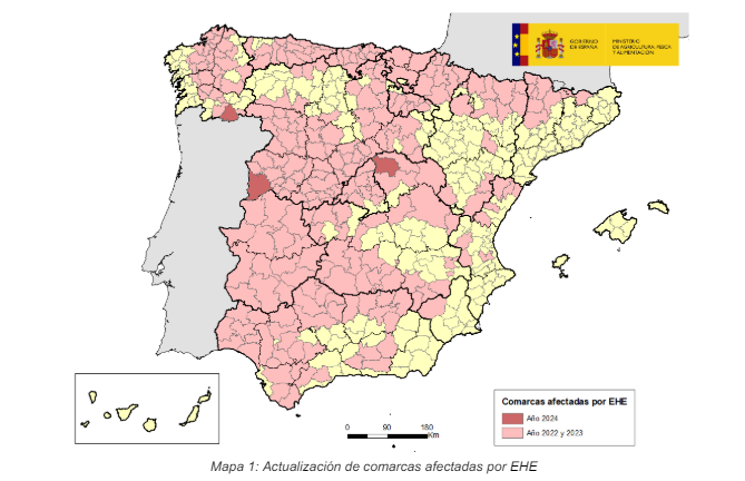 El laboratorio de Sanidad animal de Algete (Madrid) ha confirmado hoy un nuevo foco de Enfermedad Hemorrágica Epizoótica (EHE) localizado en la comarca de Ciudad Rodrigo. Se trata del tercer caso de la presente temporada vectorial 2024-25, tras notificarse el primero a principios de junio en una explotación de bovino de Guadalajara y días después otro en Orense. En los tres casos se trata de comarcas que ya se encontraron entre las 257 comarcas afectadas en la España peninsular desde que el virus se introdujera en nuestro país a finales de 2022.