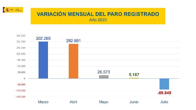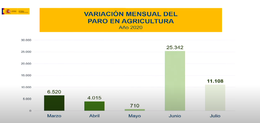 El paro registrado en el Servicio Público de Empleo Estatal (SEPE) se redujo en julio en 89.849 personas (-2,33%); salvo en la agricultura con 11.108 personas más en toda España; aunque en junio de 2020 la cifra llegó a las 25.342 personas, más del doble que en este mes de julio.
