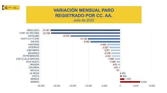 La cifra de paro registrado en el mes de julio intensifica la tendencia a la baja que se inició en el mes de mayo, tras el incremento abrupto de los meses de marzo y abril como consecuencia de la crisis sanitaria ocasionada por el COVID-19. Es la mayor caída del desempleo en un mes de julio desde 1997.