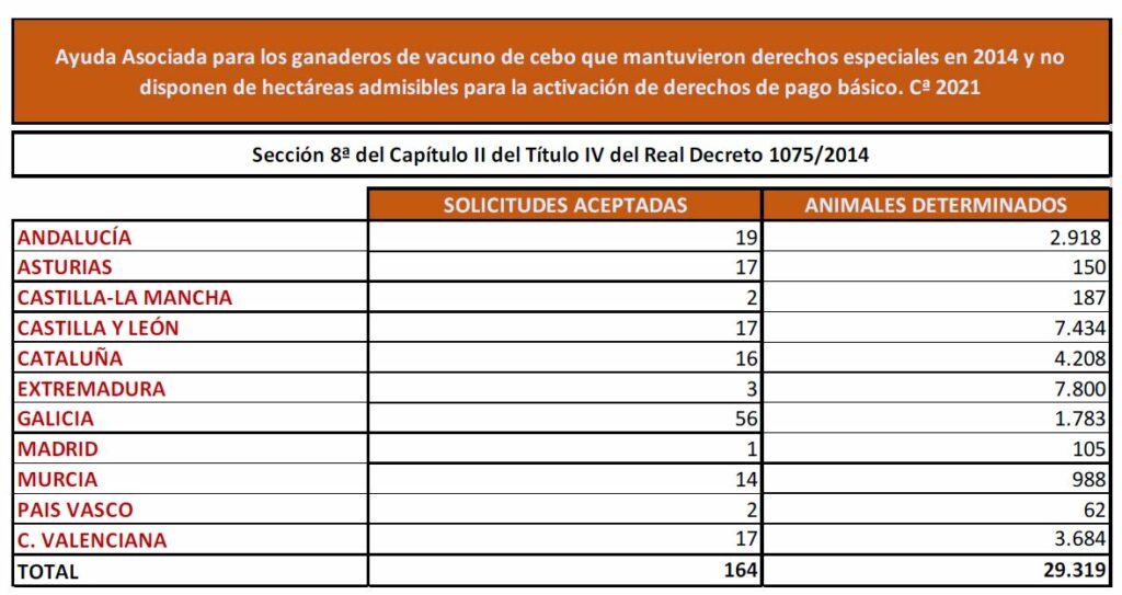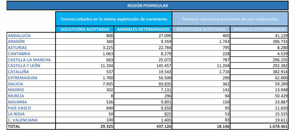 El Ministerio de Agricultura, Pesca y Alimentación ha dado a conocer el importe definitivo de las ayudas asociadas al vacuno de cebo. Para esta ayuda se diferencian dos regiones, España peninsular y región insular, diferenciándose éstas a su vez entre los animales que han sido cebados en la misma explotación de nacimiento o en cebaderos comunitarios gestionados por productores de vaca nodriza, de aquellos animales que han sido cebados y proceden de otra explotación.