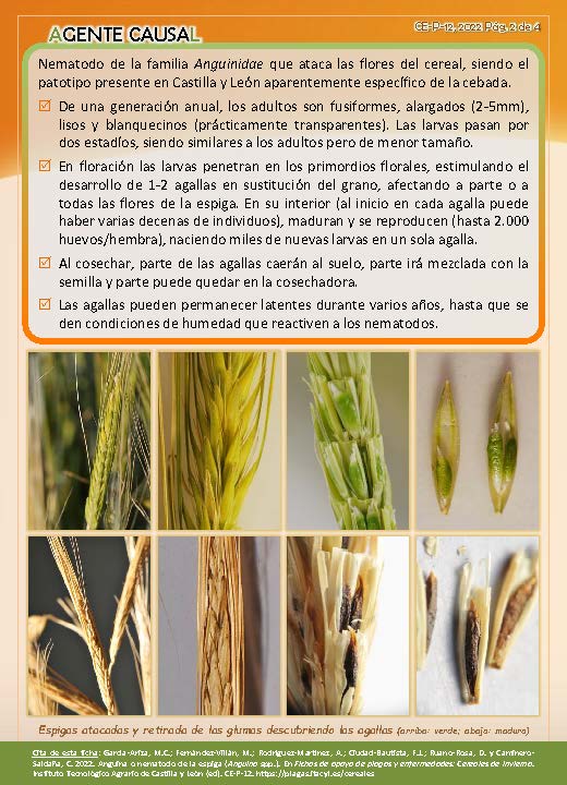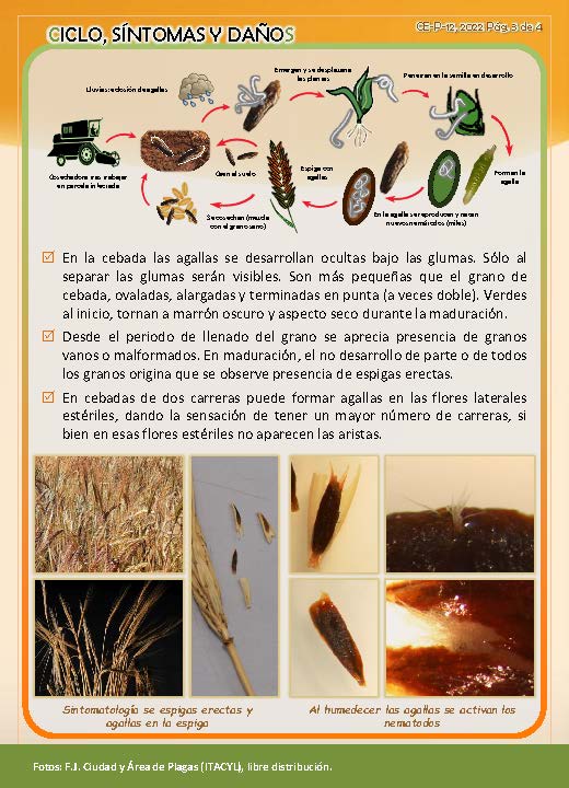 Estos nematodos, de la familia Anguinidae, atacan las flores del cereal, siendo el patotipo presente en Castilla y León aparentemente específico de la cebada. Los adultos son fusiformes, alargados (2-5mm), lisos y blanquecinos (prácticamente transparentes). Las larvas pasan por dos estadios, siendo similares a los adultos pero de menor tamaño. En floración, las larvas penetran en los primordios florales, estimulando el desarrollo de 1-2 agallas en sustitución del grano, afectando a parte o a todas las flores de la espiga. En su interior (al inicio en cada agalla puede haber varias decenas de individuos), maduran y se reproducen (hasta 2.000 huevos/hembra), naciendo miles de nuevas larvas en un sola agalla. Al cosechar, parte de las agallas caerán al suelo, parte irá mezclada con la semilla y parte puede quedar en la cosechadora. Las agallas pueden permanecer latentes durante varios años, hasta que se den condiciones de humedad que reactiven a los nematodos.