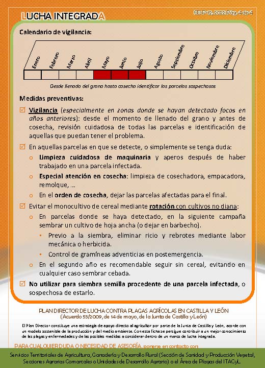 - Vigilancia (especialmente en zonas donde se hayan detectado focos en años anteriores): desde el momento de llenado del grano y antes de cosecha, revisión cuidadosa de todas las parcelas e identificación de aquellas que puedan tener el problema.