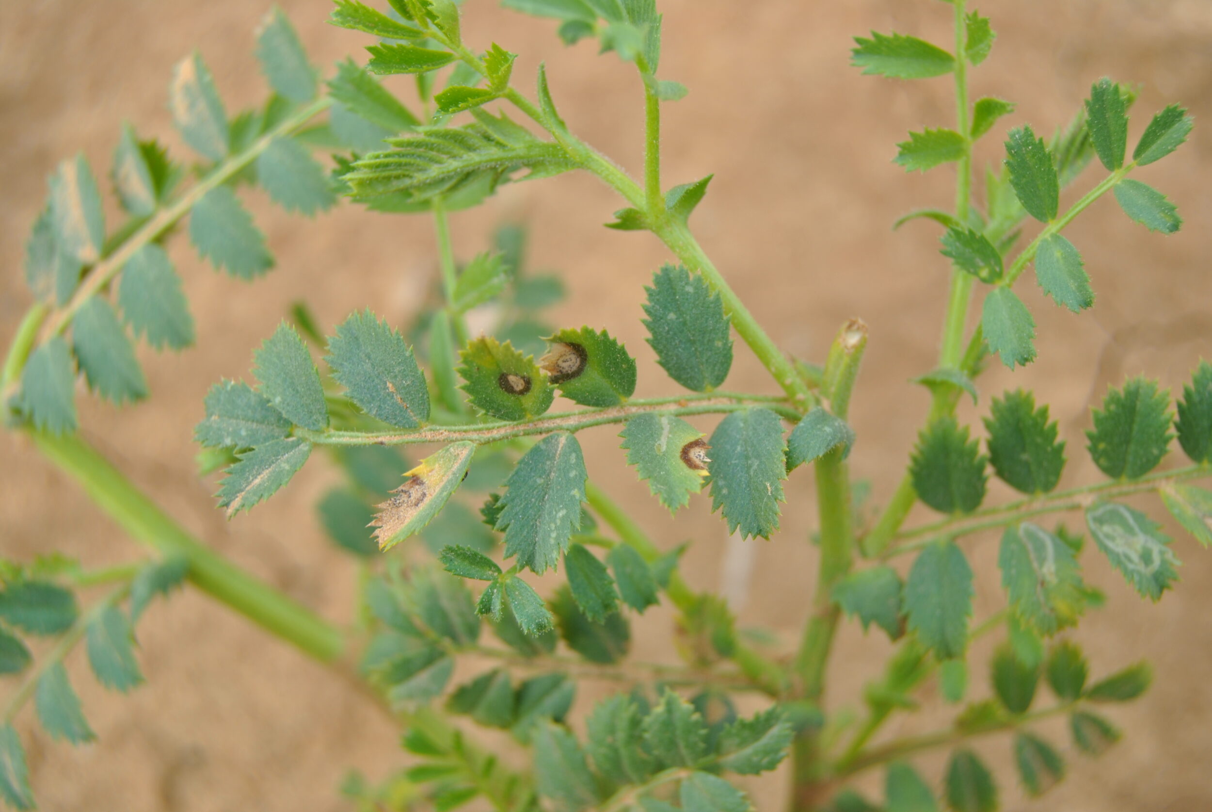 En un inicio crece en la superficie de la planta, sin ocasionar daños, hasta que penetra aprovechando pequeñas heridas (ocasionadas por heladas, granizo, maquinaria, …) o a través de los estomas de las hojas. Los primeros síntomas suelen aparecer en las hojas más bajas, como pequeñas manchas de aspecto húmedo que aumentan de tamaño y se fusionan entre ellas, adquiriendo una forma típica de palma desde la base de la estípula. Progresa por los entrenudos colonizando la planta. Puede llegar a afectar a los meristemos apicales, ocasionando necrosis de flores y vainas. Al subir la temperatura las lesiones se secan y necrosan.