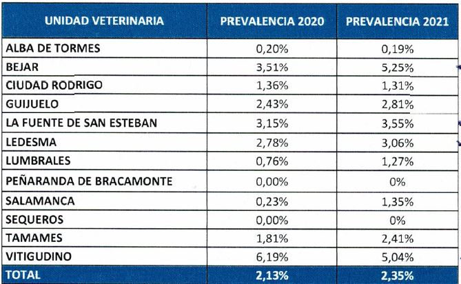 Cabe recordar que la provincia sigue encabezando, según los datos ministeriales de finales de 2021, el censo de ganado vacuno en España, con 594.420 reses; motivo por el cuál se encuentre la tuberculosis con mayor incidencia en Salamanca. Dentro de la provincia charra, la prevalencia se ha concentrado, fundamentalmente, en la Unidad Veterinaria de Vitigudino (5’04 %) y sus colindantes, como son La Fuente de San Esteban (3’55 %) y Ledesma (3’06 %). Preocupante es la zona de Béjar (5’25%) donde han repuntado los casos, superando a Vitigudino.