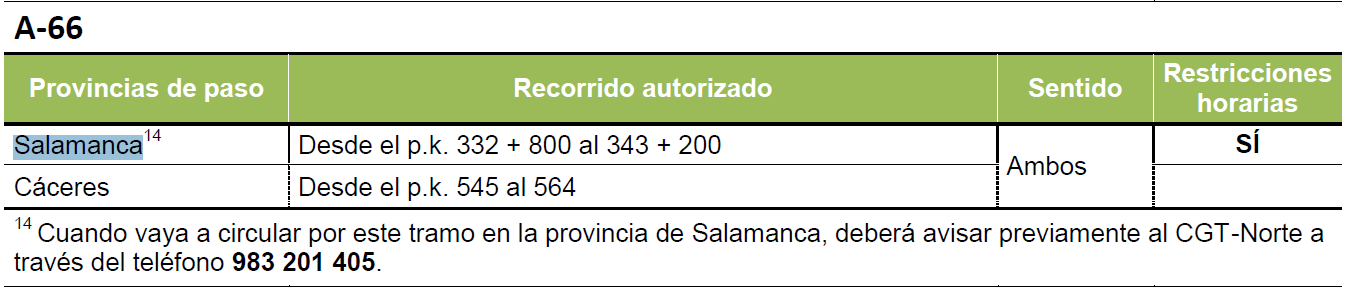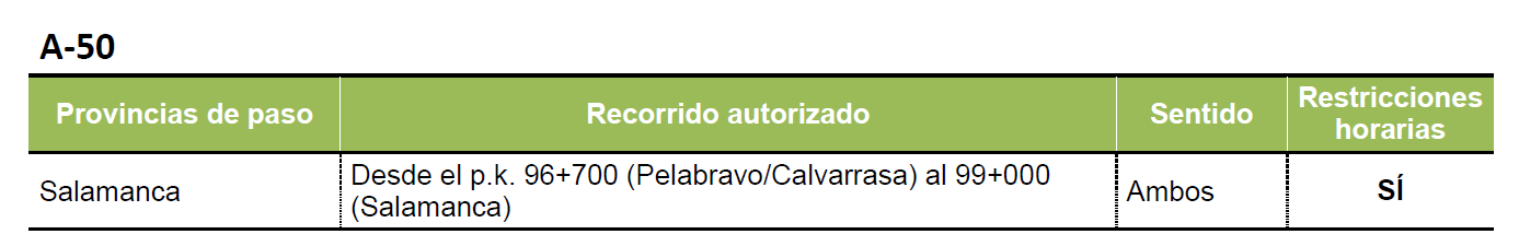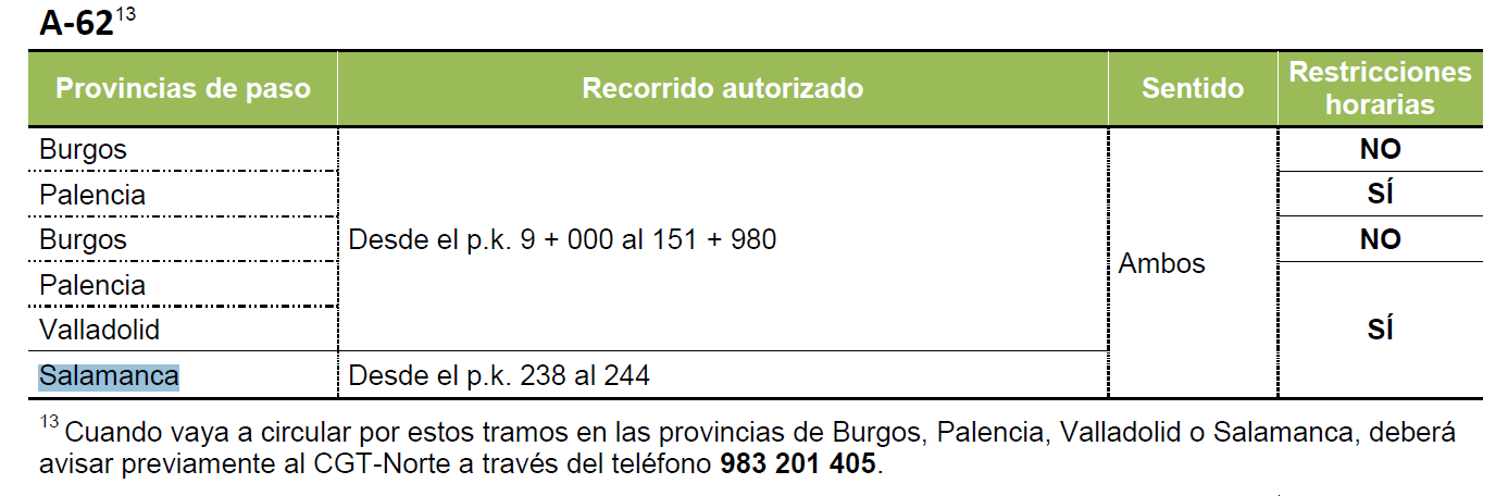 Hay que tener en cuenta que la circulación por estos tramos puede estar sujeta a restricciones horarias, como es el caso de Salamanca (entre 8:00 y 21:00 horas) y a la obligación de comunicación previa a un Centro de Gestión de Tráfico, como por ejemplo, en el tramo de Salamanca de la A-62.