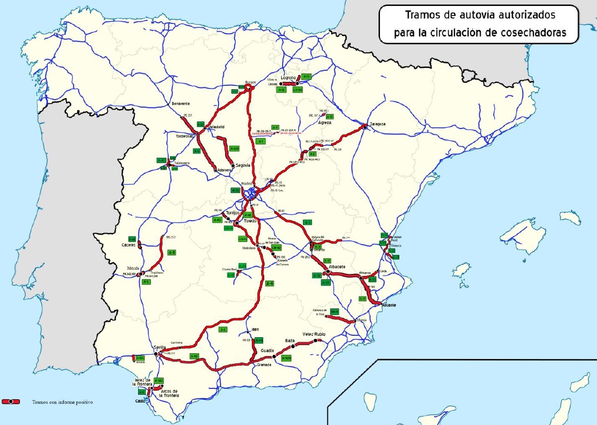 En el mapa adjunto, se recogen los tramos de autovía por los que pueden circular las máquinas agrícolas automotrices-cosechadoras que superen los límites de masas y dimensiones establecidos reglamentariamente, para los cuales no existe itinerario alternativo adecuado por vía convencional.