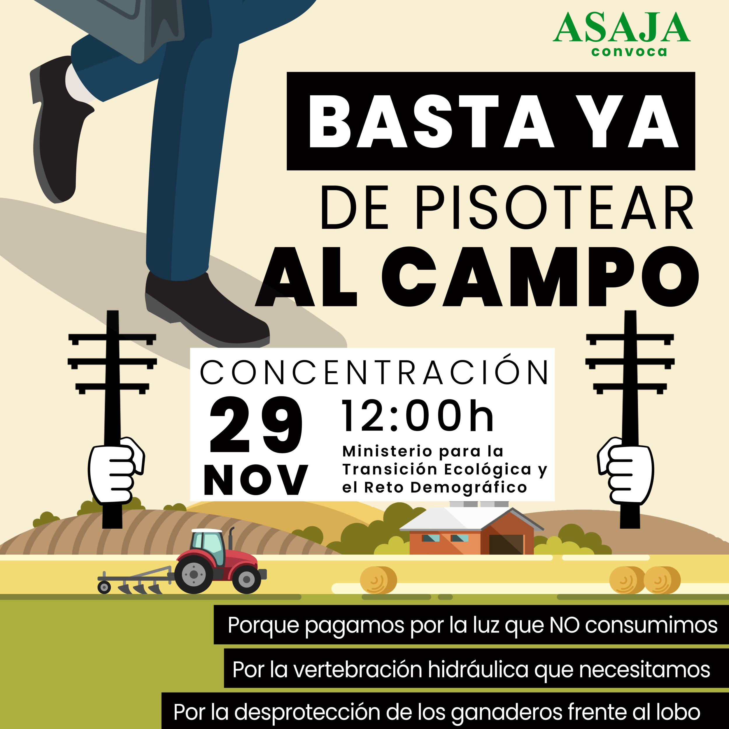 La Asociación Agraria Jóvenes Agricultores- ASAJA ha convocado para el próximo martes, 29 de noviembre, a las 12:00 horas, una concentración de agricultores y ganaderos ante el Ministerio de Transición Ecológica y Reto Demográfico en protesta por las “políticas tremendamente lesivas y los ataques injustificados” al sector agrario que está llevando a cabo este ministerio en materia energética, hidráulica y de protección de especies.