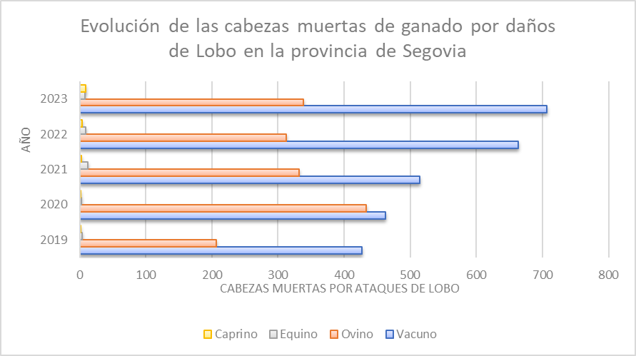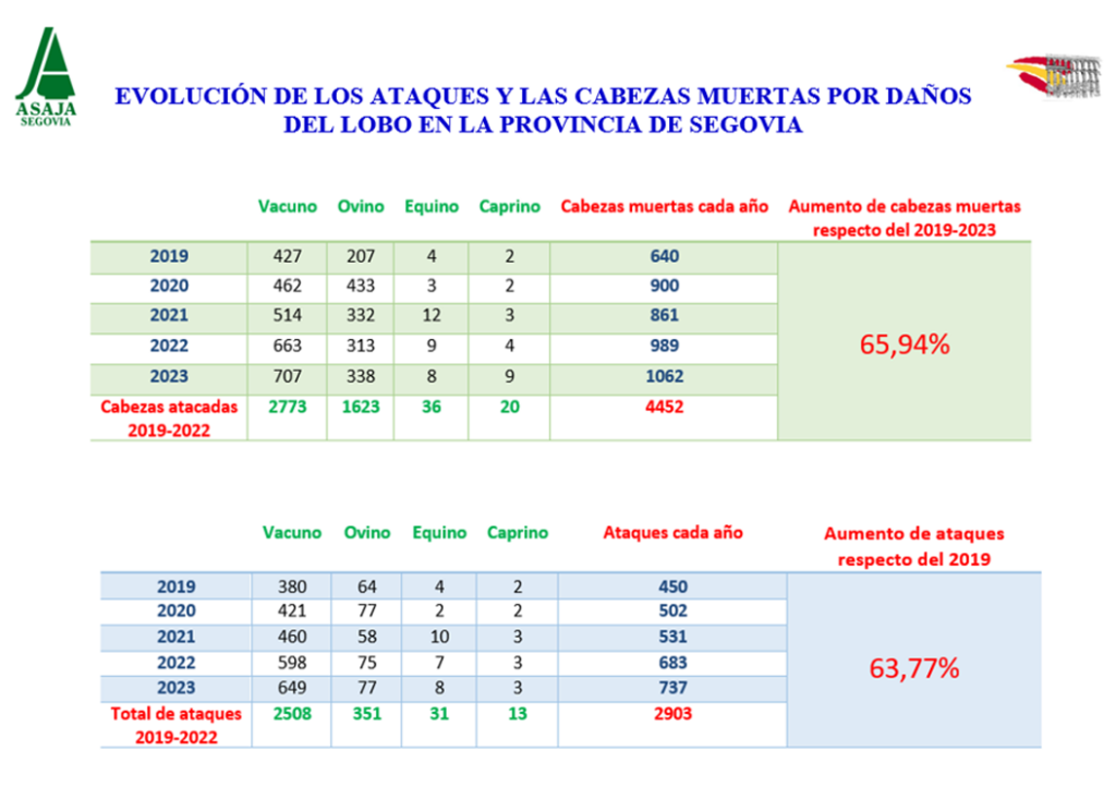 Durante el año 2023 en la provincia de Segovia, los lobos han matado 1.062 cabezas de ganado, de las cuales un 67% corresponden a ganado vacuno y un 32% al ovino. Estas 1.062 cabezas se corresponden a 737 ataques a lo largo de todo el año, de los que de media en el ganado vacuno matan 1 animal por ataque y en el ovino matan 4 animales por ataque.