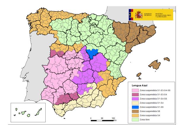 Ante la constatación de circulación de los serotipos 1, 3 y 8 del virus, las autoridades veterinarias de la Junta de Castilla-La Mancha, Junta de Extremadura, Junta de Andalucía y de la Comunidad de Madrid, han procedido a ampliar las zonas suspendidas para estos serotipos alrededor de los focos detectados, afectando a varios territorios de Castilla y León.