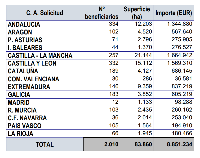 En total, en Castilla y León han sido beneficiarios 332 agricultores por un importe total de 1.569.310 euros y 15.112 hectáreas, siendo la segunda comunidad autónoma en número de beneficiarios, superficie y presupuesto.