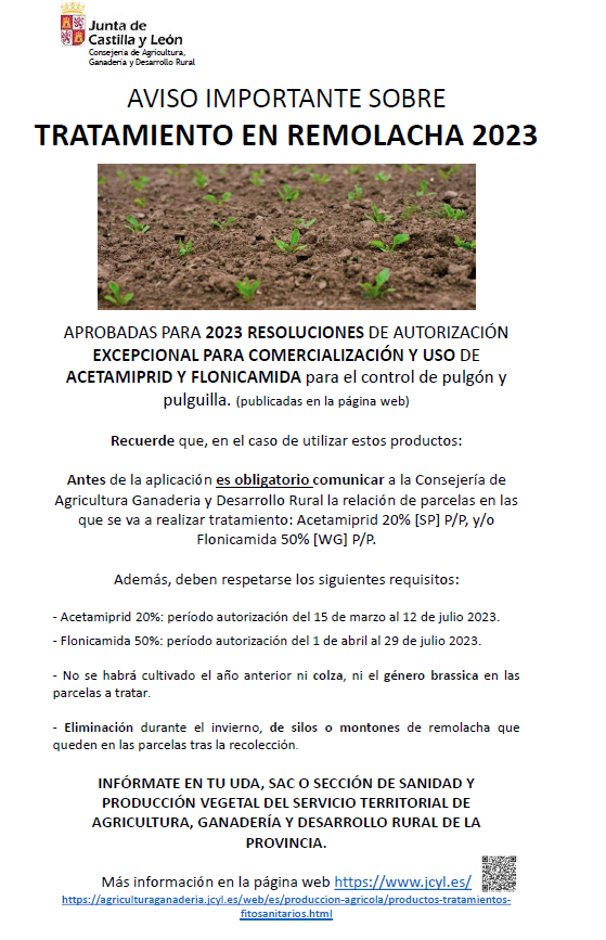 Finalmente, la Dirección General de Producción Agrícola y Ganadera la Dirección General de Sanidad de la Producción Agraria del Ministerio de Agricultura, Pesca y Alimentación ha aprobado sendas autorizaciones excepcionales para la comercialización y el uso de productos fitosanitarios en el cultivo de la remolacha en la campaña 2023, estableciendo las condiciones de uso de estos productos y las de medidas preventivas a cumplir.