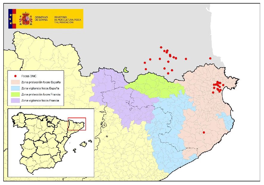 Mapa 1. Localización de los focos de DNC en Cataluña y en el departamento francés de Pirineos Orientales, junto con las ZP y ZV establecidas en España (04/12/2025)