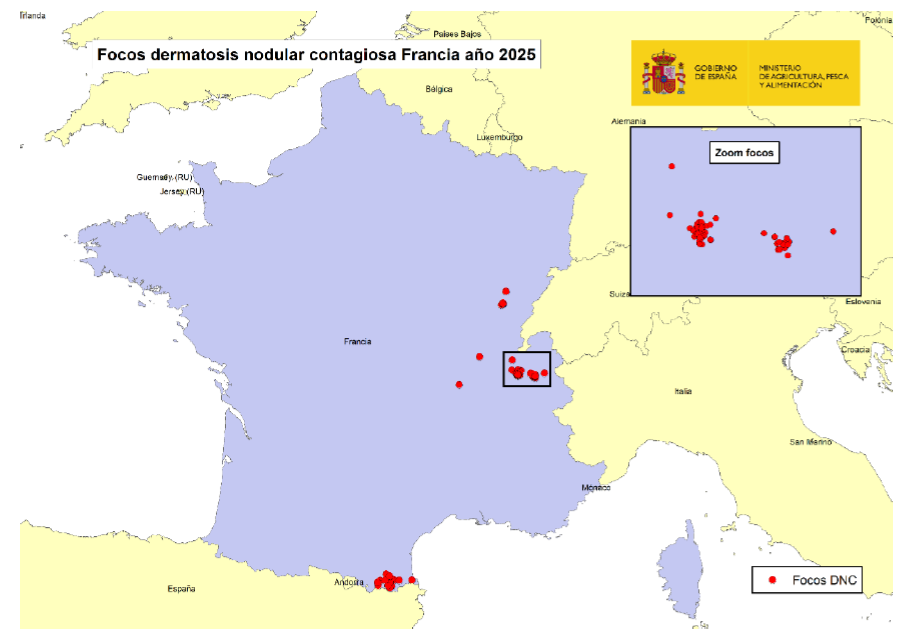 En cuanto a la situación epidemiológica en Francia, los SVO franceses han informado de nuevos focos en las dos zonas de restricción que siguen vigentes, la ZR3 (departamento de Pirineos Orientales) y la ZR4 (departamento de Jura). En Pirineos Orientales (ZR3), limítrofe con Cataluña, se han detectado un total de 20 focos, alguno de ellos conlleva la ampliación de la zona de protección que afecta a nuestro territorio (ver mapas 1 y 2). El número total de focos en Francia desde el mes de junio se eleva a 108.