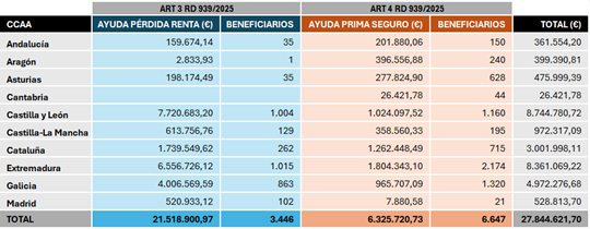 En España, un total de 9.679 agricultores y ganaderos recibirán estas ayudas directas que comprenden dos líneas: la compensación por pérdida de renta en las explotaciones agrarias afectadas y el apoyo adicional al coste del seguro agrario para titulares de pólizas. Toda la información relativa a estas subvenciones está disponible en la web del Ministerio.
