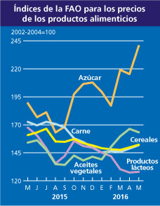 El índice de precios de los alimentos de la FAO se situó en mayo de 2016 en un promedio de 155,8 puntos, es decir, 3,2 puntos (un 2,1 %) más que en abril, aunque todavía un 7 % menos que en el mismo periodo del año pasado. El incremento de mayo representa el cuarto mes consecutivo de aumento en el valor del índice. En mayo subieron los valores de todos los subíndices con excepción del de los aceites de origen vegetal, que disminuyó por primera vez en cuatro meses. Repuntaron los precios del azúcar, mientras que los de la carne, los cereales y los productos lácteos registraron un ligero aumento.