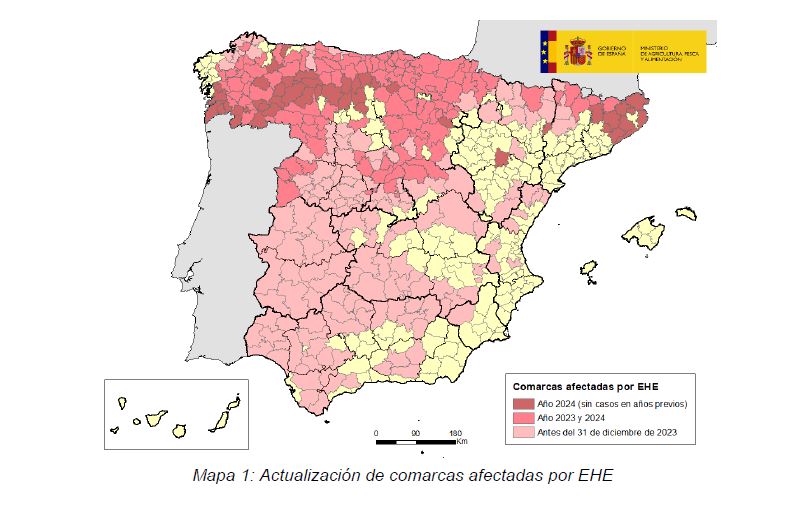 Desde la última actualización sobre la situación de la Enfermedad Hemorrágica Epizoótica (EHE) realizada el pasado 25 de septiembre, los laboratorios regionales y el Laboratorio Central de Veterinaria (LCV) de Algete, laboratorio nacional de referencia para esta enfermedad, han confirmado la presencia de enfermedad en varias explotaciones de bovino localizadas en las comarcas de Segovia y Cantalejo (provincia de Segovia), Cervera de Pisuerga (provincia de Palencia), Valencia de Don Juan (provincia de León), Lena y Gijón (Asturias), Tamarite de Litera (provincia de Huesca) y Belchite (provincia de Zaragoza). Estas comarcas ya habían resultado afectadas en 2023, excepto Cervera de Pisuerga, Tamarite de Litera y Belchite (Ver mapa 1).