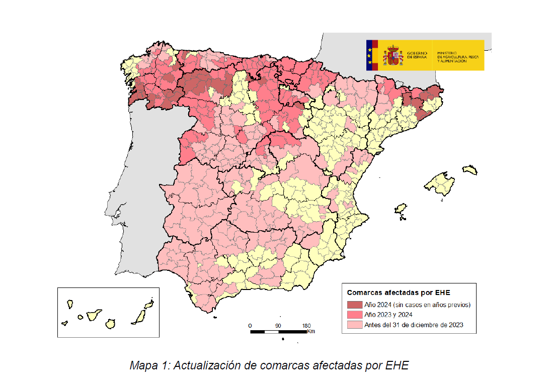 Desde la última actualización sobre la situación de la Enfermedad Hemorrágica Epizoótica (EHE) realizada el pasado 11 de septiembre, los laboratorios regionales y el Laboratorio Central de Veterinaria (LCV) de Algete, laboratorio nacional de referencia para esta enfermedad, han confirmado la presencia de enfermedad en varias explotaciones de bovino localizadas en las comarcas de Arzúa, Terra de Melide, Teixeiro, Santiago y As Pontes (provincia de A Coruña), Colmenar Viejo (Madrid), Olmedo (provincia de Valladolid), Aguilar de Campoo (provincia de Palencia), Medina de Pomar, Miranda de Ebro y Villadiego (provincia de Burgos), San Pedro Manrique (provincia de Soria), Sahagún (provincia de León), Manganeses de la Lampreana y Benavente (provincia de Zamora),Tineo, Piloña, Cangas de Onís, Navia, Laviana, Cangas de Narcea y Vegadeo (Asturias), San Vicente de la Barquera y Ramales (Cantabria), Maresme (provincia de Barcelona), Pla de l’Estany (provincia de Girona) y Alt Urgell (provincia de Lleida). Asimismo, se ha confirmado 1 caso en ciervo en la comarca de Santibáñez de Vidriales (provincia de Zamora).