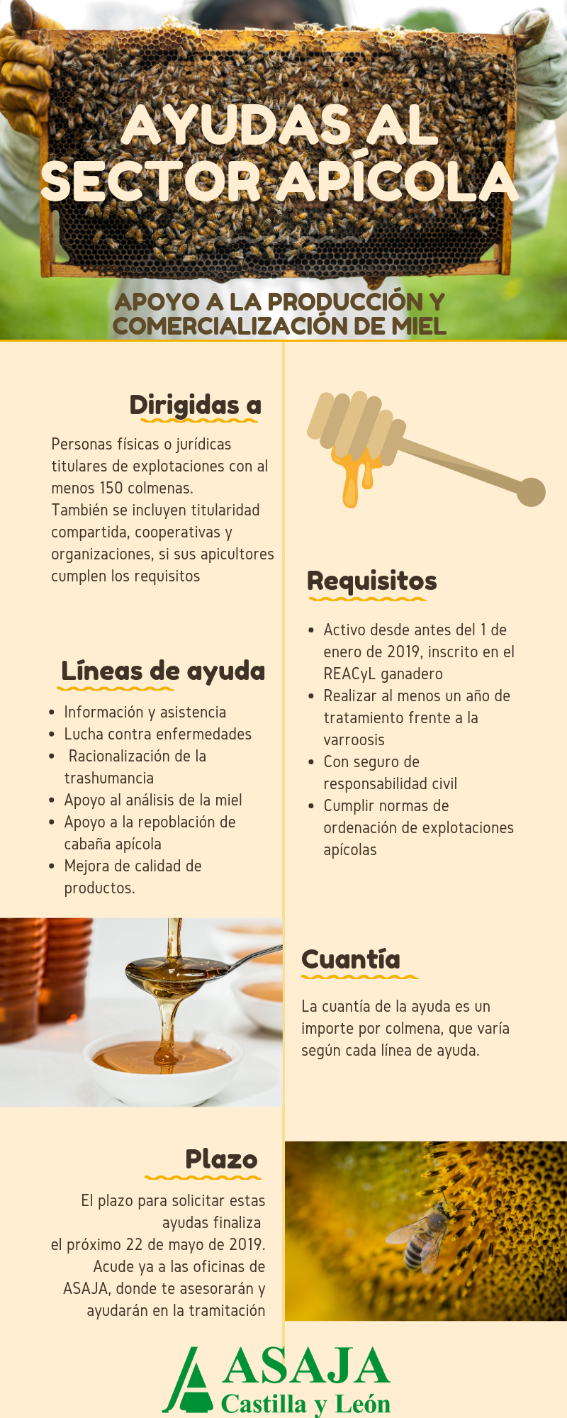 La Consejería de Agricultura y Ganadería ya ha convocado las ayudas a la producción y comercialización de la miel para este año 2019. El plazo está abierto hasta el próximo 22 de mayo, por lo que todos los interesados pueden acercarse ya a las oficinas de ASAJA para tramitar su solicitud.