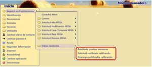 Para ello, se deberá acceder al Módulo Ganadero y dentro del menú principal: -Registro de explotaciones-Datos sanitarios.