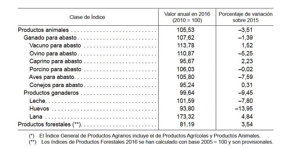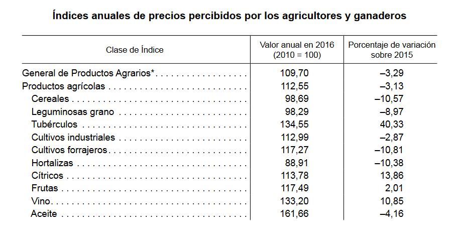 Por ello, el ministerio difunde los valores del índice anual de precios percibidos por los agricultores y ganaderos en 2016 y su incremento respecto al año 2015, tanto para el índice general agrario como para los principales índices de productos.