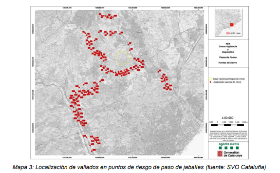 Siguen las intensas labores de búsqueda de cadáveres de jabalíes y actividades para la reducción de las poblaciones de jabalíes en la zona infectada, principalmente mediante el empleo de trampas para la captura de jabalíes y control poblacional realizada por agentes rurales y cazadores formados específicamente bajo supervisión de la autoridad competente. De igual modo, se continúa trabajando en las medidas de aislamiento, vallados, aprovechando vallados ya existentes en carreteras y vías férreas, y priorizando el control de corredores de uso de jabalíes, que se van adaptando a la evolución de la situación epidemiológica, en particular el seguimiento constante de la distribución espacial de casos, así como los pasos de mayor riesgo. Los vallados instalados se han establecido para cubrir más de 180 puntos de paso en los que se han instalado pasos trámex y otros tipos de barreras para evitar que los jabalíes entren o salgan de la zona, permitiendo el paso de vehículos y personas (ver mapa 3).