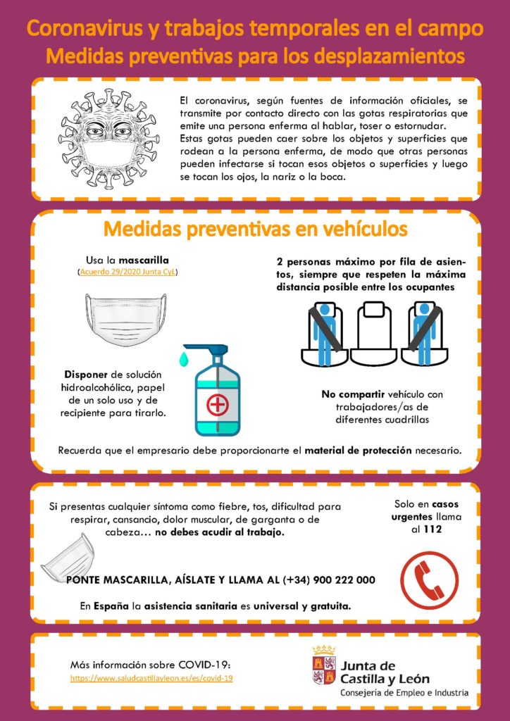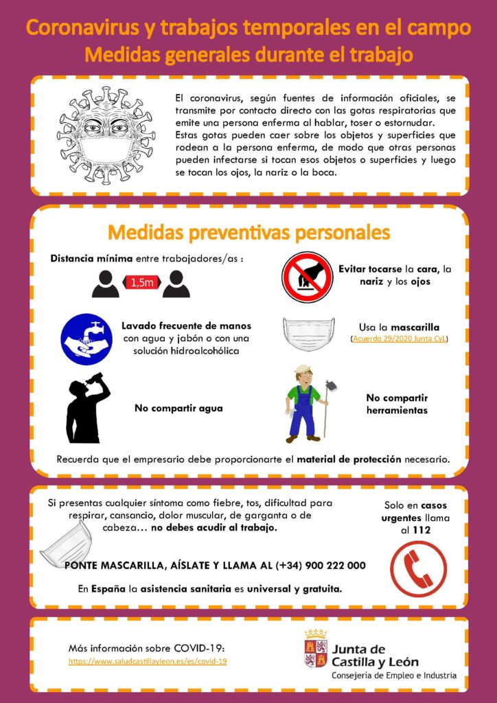 La crisis sanitaria que padecemos condiciona también el desarrollo de los trabajos temporales en el campo. El Servicio de Prevención de Riesgos Laborales de la Consejería de Empleo de la Junta de Castilla y León recoge en tres fichas una serie de consejos a tener en cuenta.