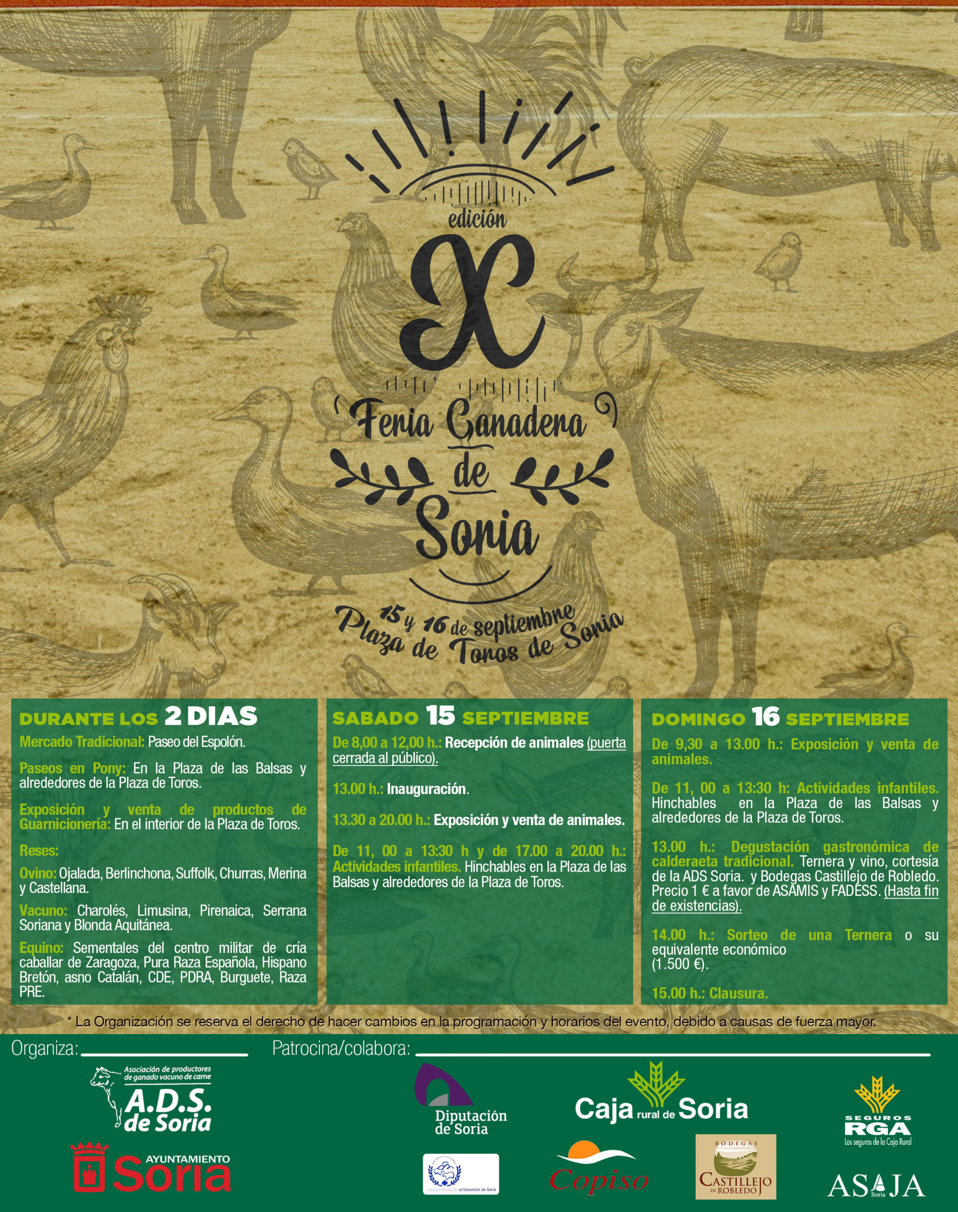 ASAJA Soria anima a toda la provincia a que acuda a la Feria Ganadera de Soria, que se celebrará los días 15 y 16 de septiembre en la plaza de toros de la capital. La feria, que cumple su décima edición y ya se ha asentado en el calendario nacional, reunirá a cerca de 25 expositores, sobre todo de la zona norte del país, con cabezas selectas de cabaña de bovino y ovino. Este evento presentará una especial atención a que los ganaderos accedan a sementales de alta genética de ganaderías punteras de razas cárnicas, como es el caso de las razas blonda de Aquitania, limusina, charolés, pirenaica y serrana soriana en cuanto a vacuno y ojalada, berrinchona, suffolk, curras, merinas y castellana en ovino. El Centro Militar de cría caballar de Zaragoza expondrá también sementales de pura raza española, hispano bretón, asno catalán, etc.