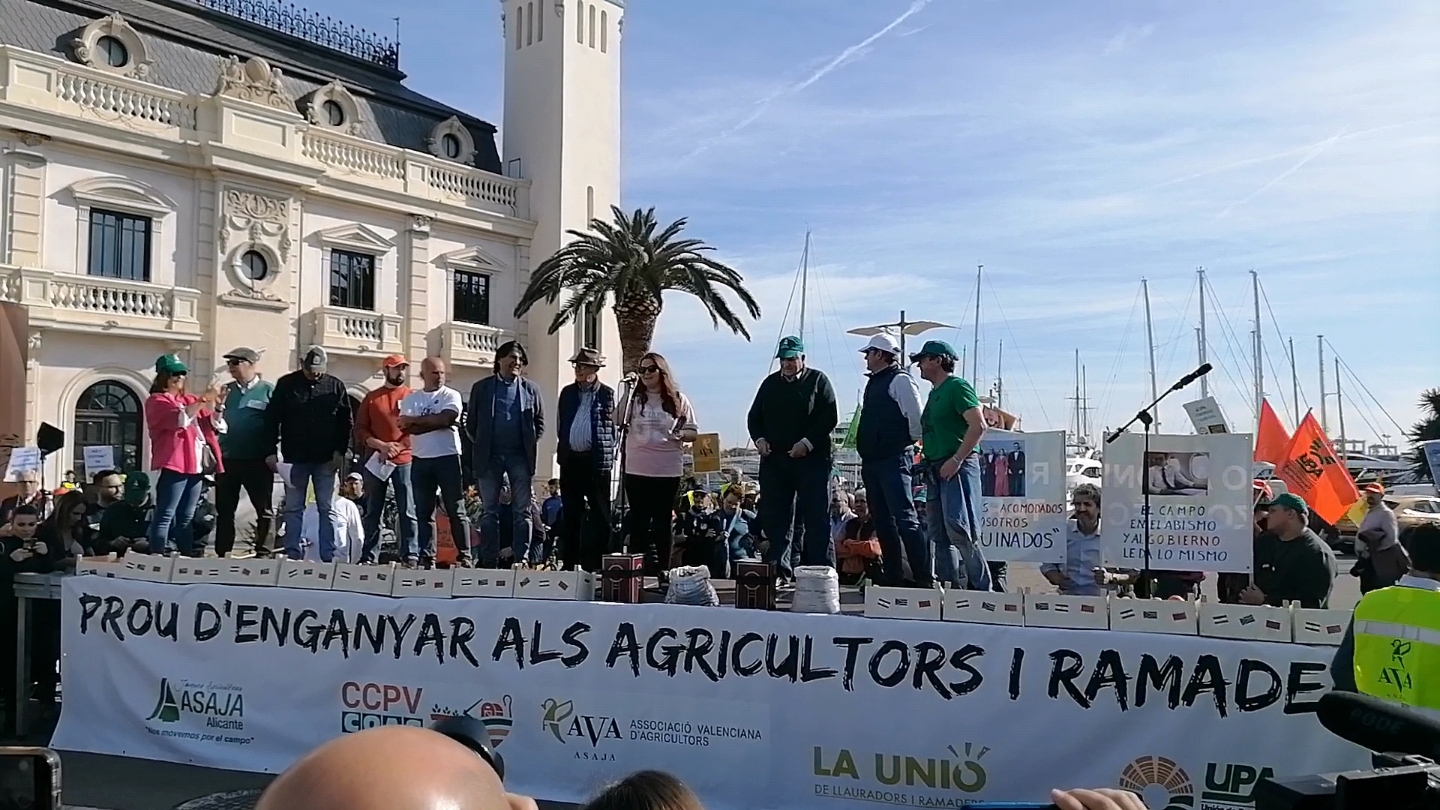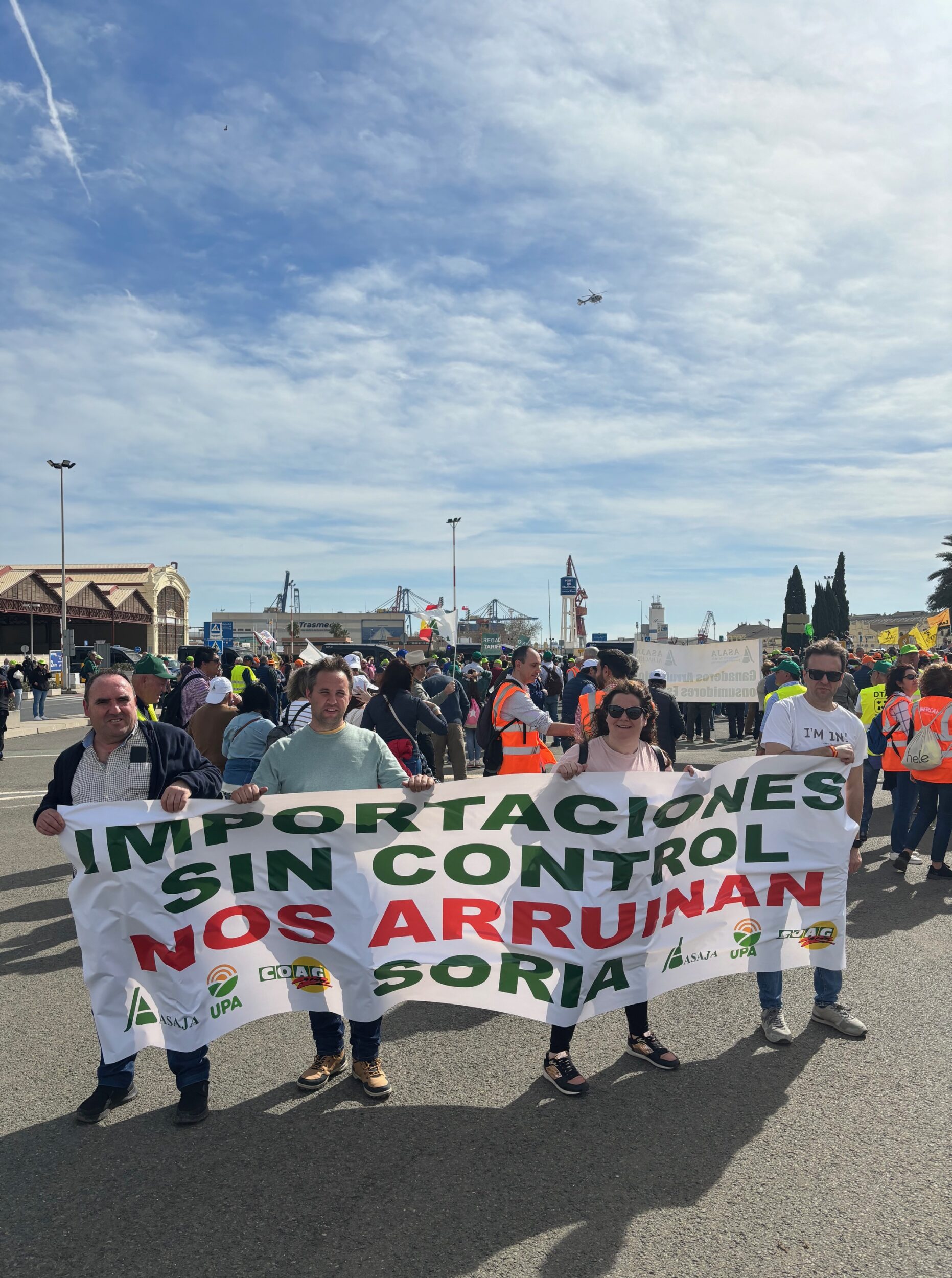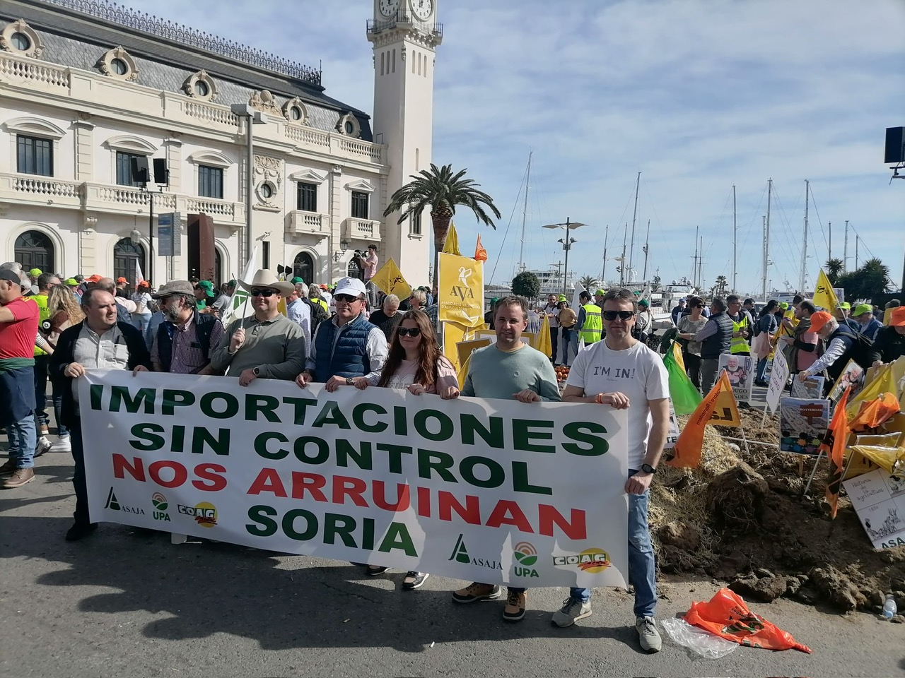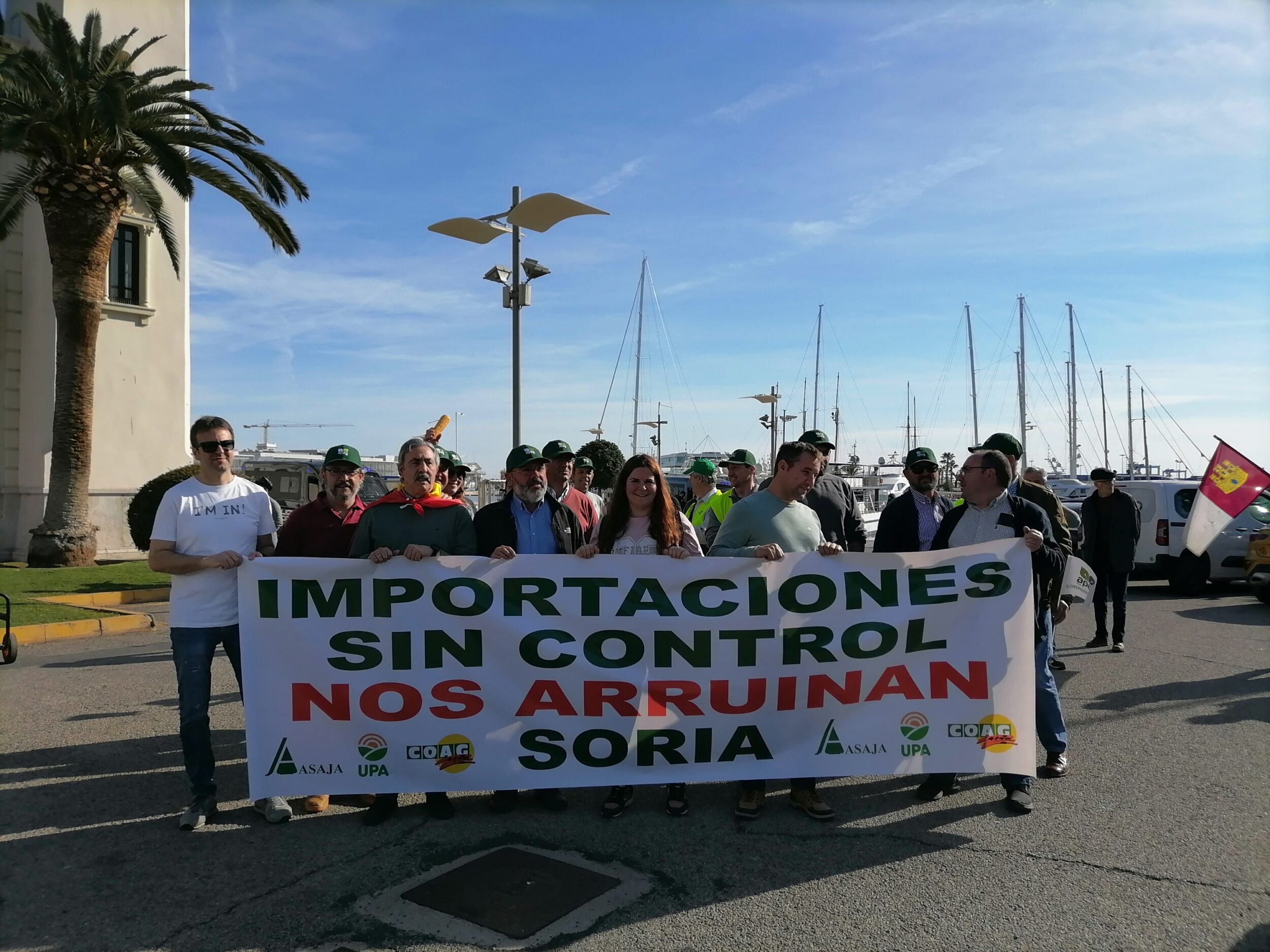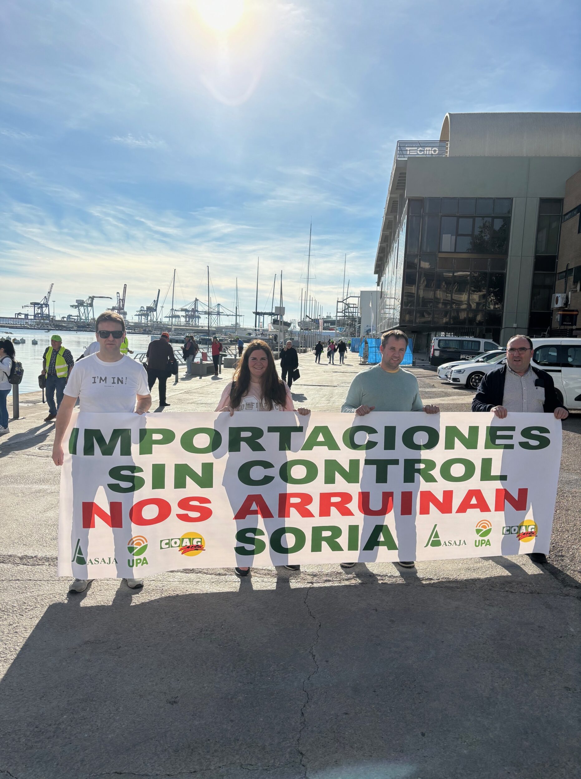 ASAJA Soria, con una pancarta en la que podía leerse: ‘ importaciones sin control nos arruinan‘, ha pedido a orillas del Mediterráneo, en el segundo puerto con más volumen de España, que se tenga en cuenta la opinión de los agricultores y que se garantice la preferencia comunitaria y la reciprocidad con las importaciones de países terceros, que se frenen los abusos comerciales y los bajos precios, y un cumplimiento estricto de la Ley de la Cadena Alimentaria.