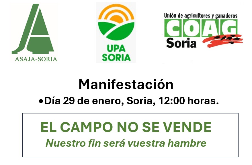 El próximo día 29 de enero, en Soria capital, como coordinadamente se hará por toda España, celebraremos una Manifestación y Concentración, desde Mariano Vicén, pasando por la Delegación Territorial de la Junta de Castilla y León y la Subdelegación del Gobierno, para terminar con un acto solemne de sepelio por la Agricultura y Ganadería Soriana, Española y Europea, en la Plaza de Mariano Granados».