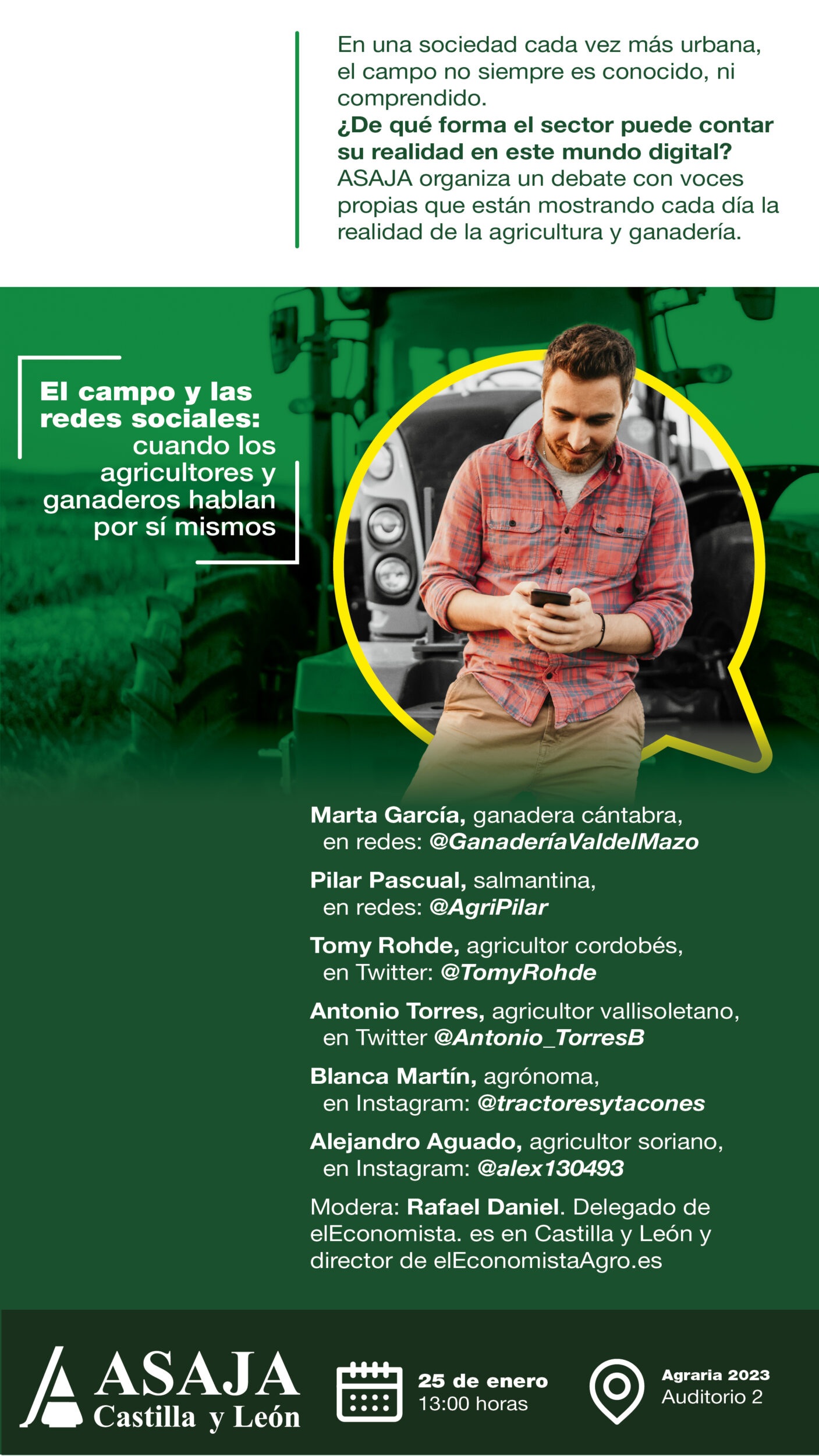 Además, ASAJA organiza mañana 25 de enero a las 13 horas un debate, bajo el título ‘El campo y las redes sociales: cuando los agricultores y ganaderos hablan por sí mismos’. ASAJA ha querido dar un espacio a voces propias e influyentes que están mostrando cada día la realidad de la agricultura y ganadería, a través de sus perfiles en Instagram, Twitter, Facebook o TikTok. En una sociedad cada vez más urbana, el campo no siempre es conocido, ni comprendido, y es importante destacar la iniciativa de los propios profesionales del sector para contar su realidad en este mundo digital.