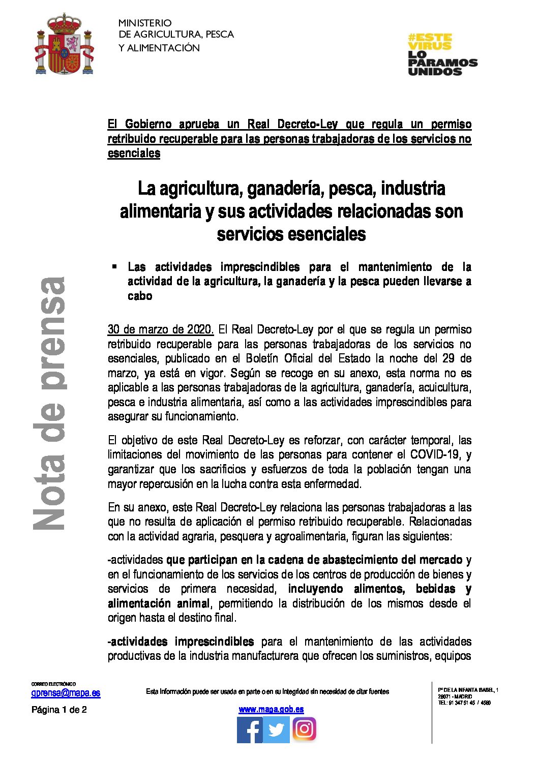 PINCHA UN POCO MÁS ABAJO Y PODRÁS LEER LA NOTA DE PRENSA DEL MINISTERIO DE AGRICULTURA.