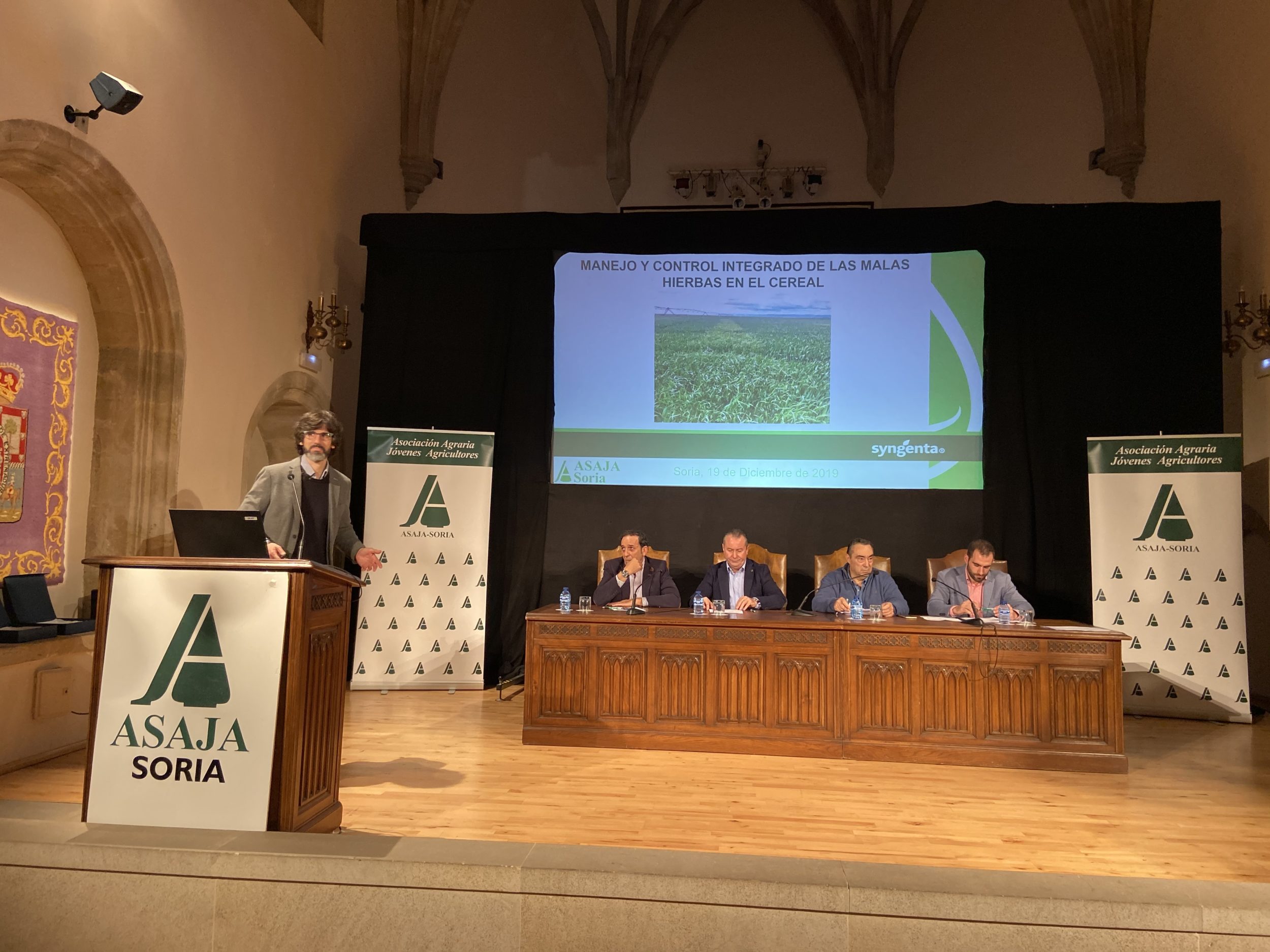 Desde la junta directiva de la organización profesional agraria se pretende siempre también que la jornada de concesión de estos premios se afiance como un día específico para la reflexión, el debate y para el análisis de los principales retos del sector primario. Por ese motivo, en esta ya decimotercera edición, ASAJA Soria organizó, de forma complementaria a la entrega de los galardones, una ponencia específica auspiciada por Syngenta en la que se abordó el manejo y el control integrado de malas hierbas. El encargado de desarrollar este asunto fue Rubén del Val, del departamento técnico de Syngenta, que apuntó varios aspectos clave sobre el conocimiento de las parcelas objeto de tratamiento, las resistencias, la eficacia de los fitosanitarios y los problemas de control en post emergencia de gramíneos clásicos, entre otros muchos aspectos.