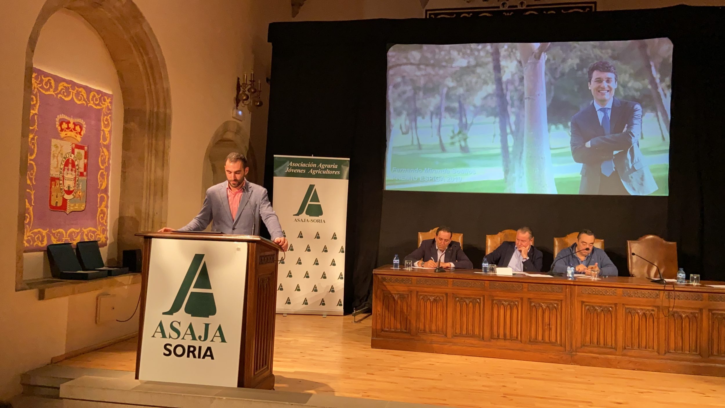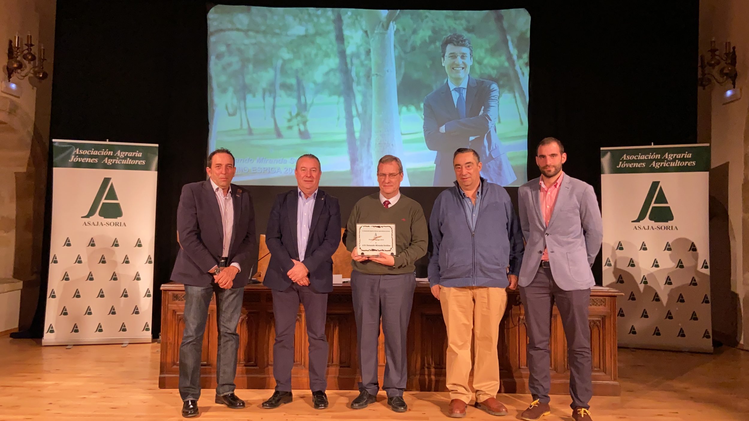 Fernando Miranda Sotillos recibió la mañana el jueves 19 de diciembre el Premio Espiga 2019. Al no poder asistir personalmente, fue su hermano Agustín el encargado de recoger esta distinción, de manos del presidente de ASAJA-Soria, Carmelo Gómez, en una sencilla ceremonia en el Aula Magna Tirso de Molina de la capital soriana, una histórica sala abarrotada de profesionales del campo que no querían perderse esta importante cita que ya es un referente para el mundo del agro en la provincia y en toda la región durante las fechas navideñas. La concesión del premio se debe al tesón, esfuerzo y buen trabajo en el impulso y la consecución de mejoras para los agricultores y ganaderos en sus 30 años de incansable desempeño profesional dentro del MAPA y en la confianza de que este reconocimiento público del agro soriano le sirva como un estímulo más para continuar ante los retos que aguardan al sector.