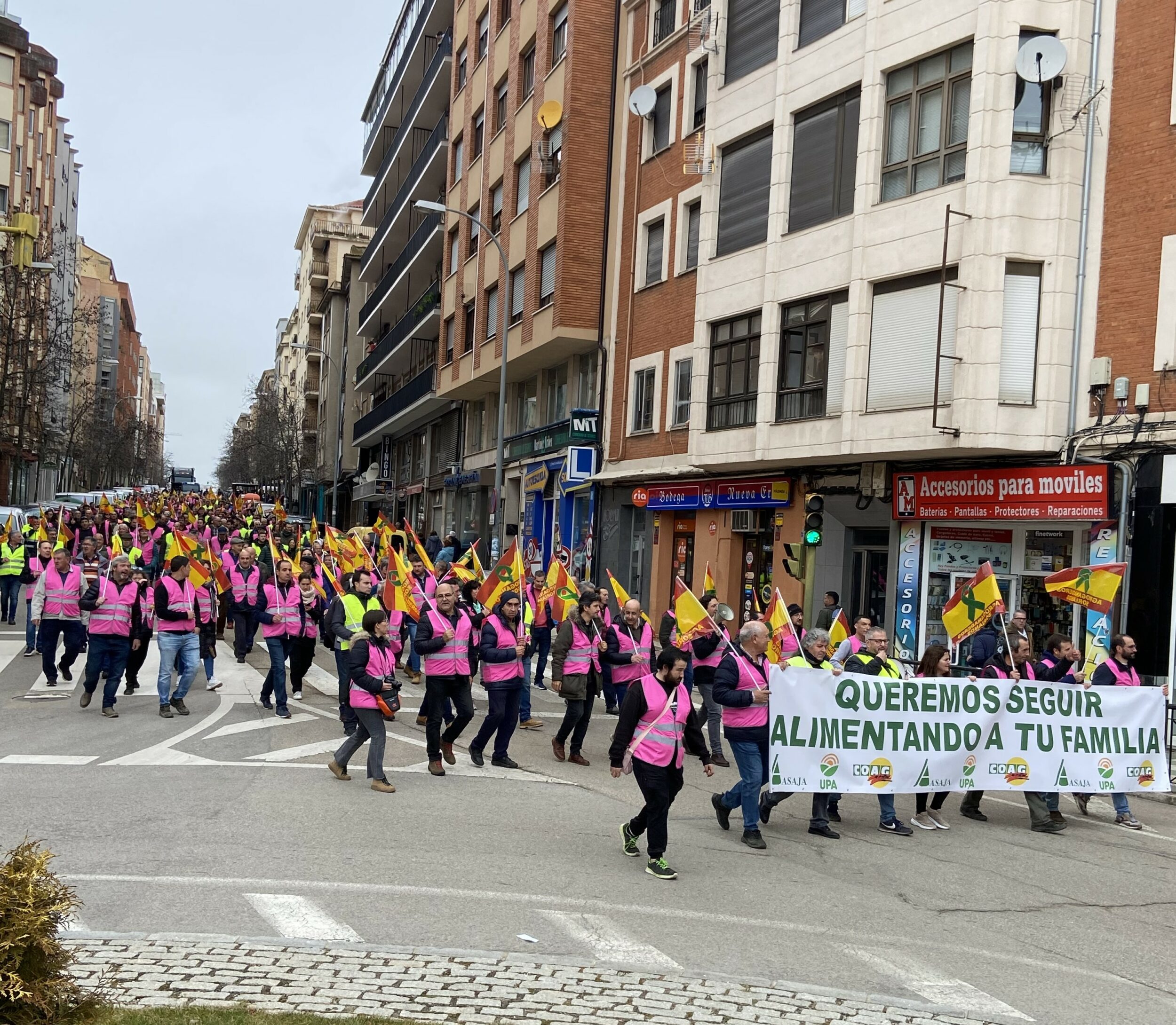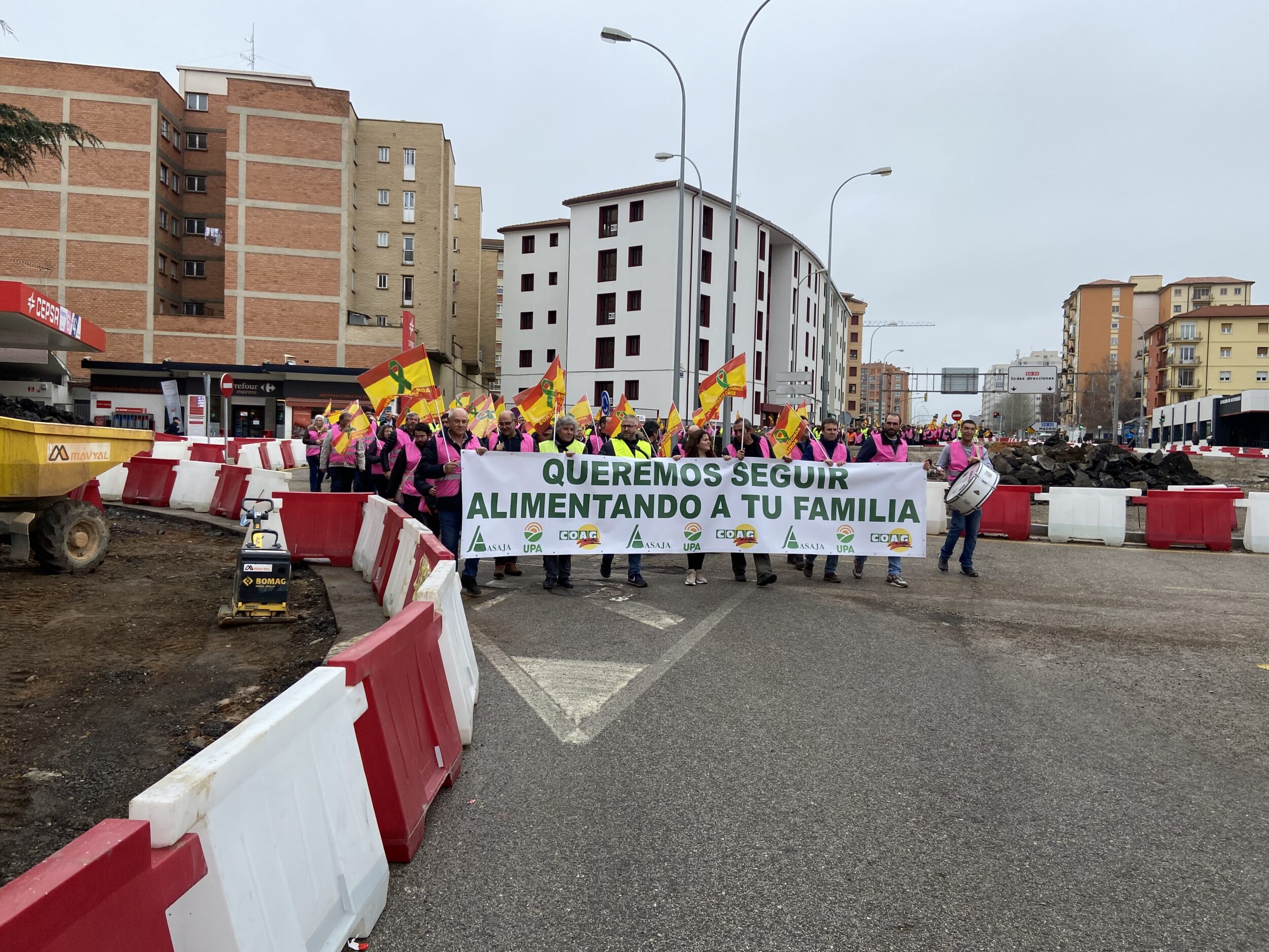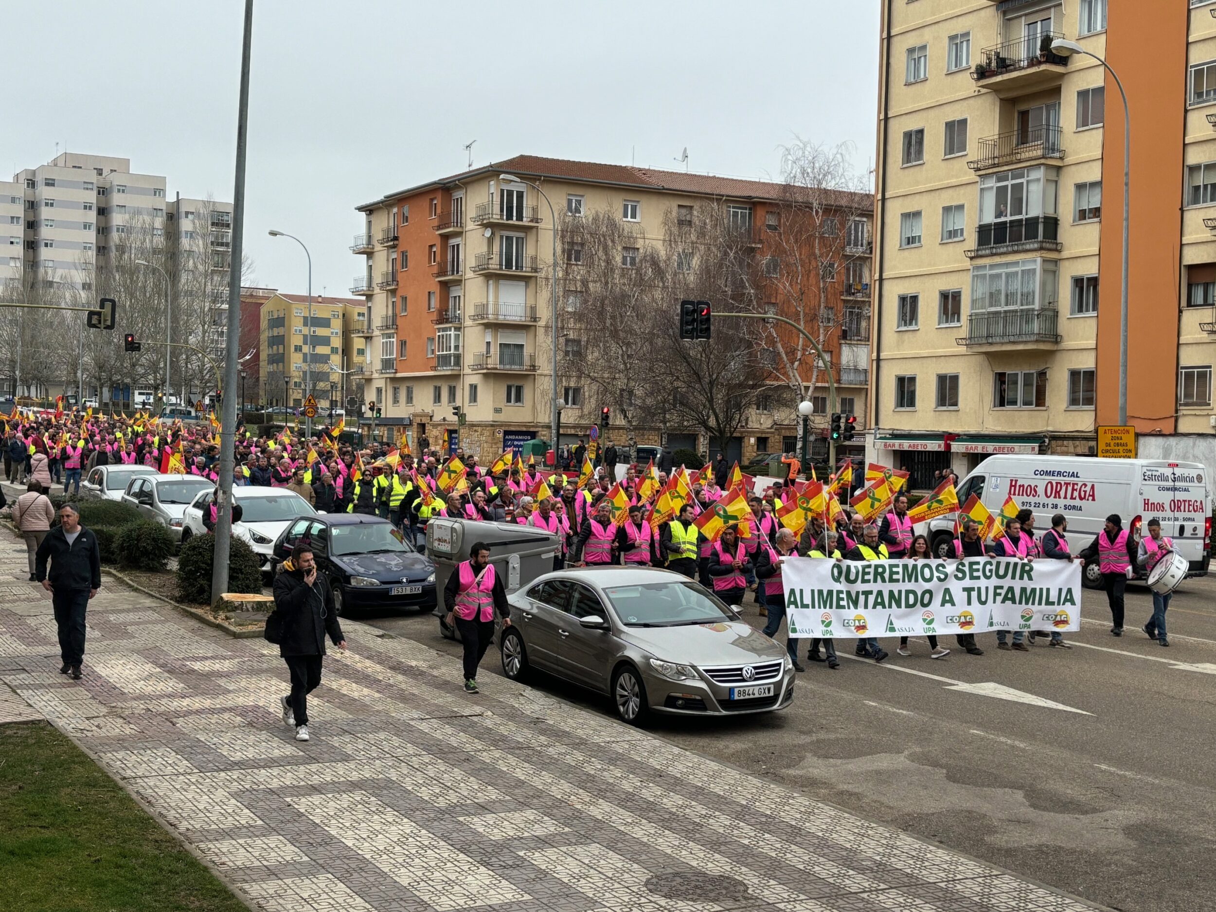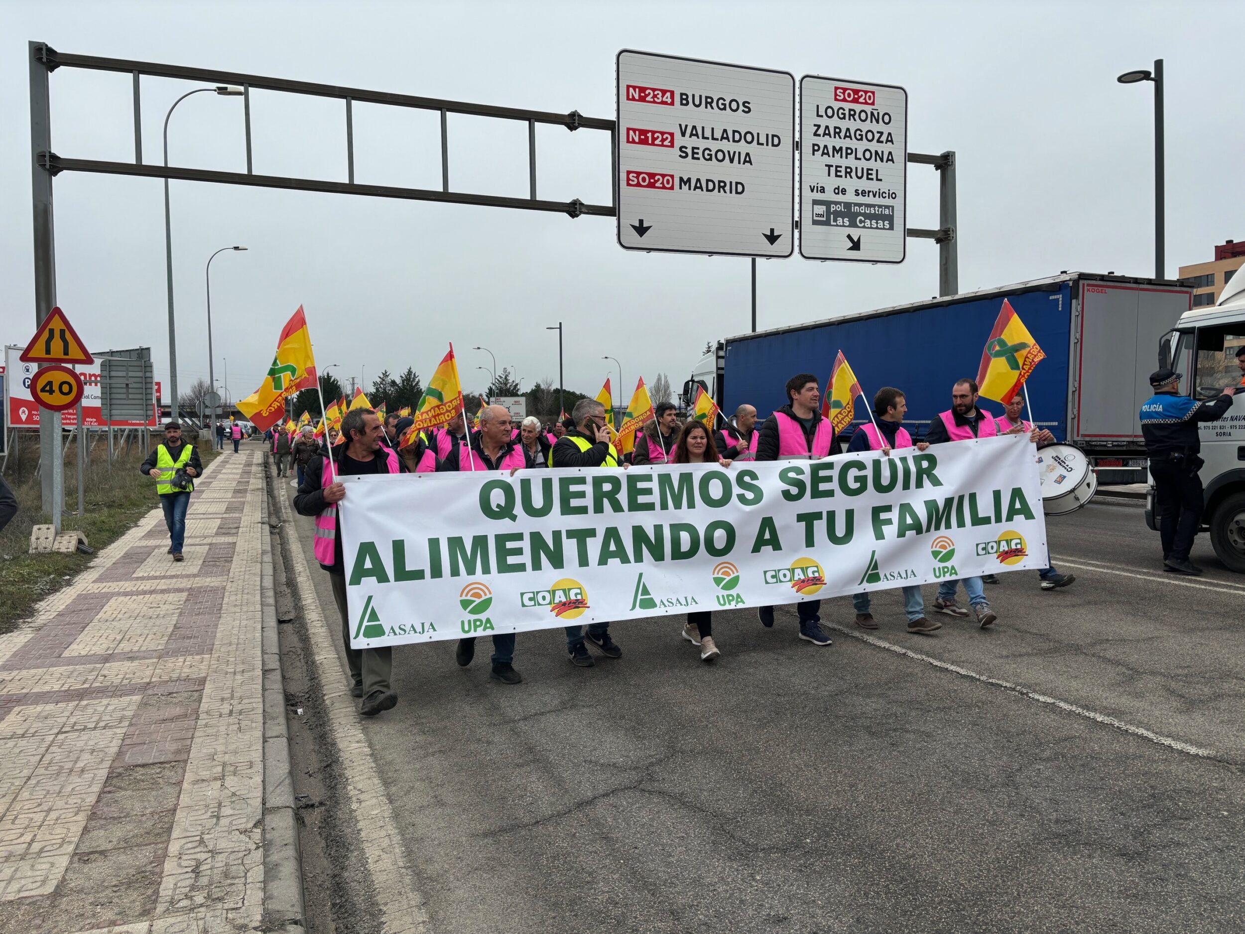 El 14 de febrero el campo soriano se ha movilizado. El lema elegido ha sido: ‘queremos seguir alimentando a tu familia’. La actividad reivindicativa arrancó a primera hora, con cortes de las vías principales de acceso a la ciudad en la zona del Caballo Blanco, lo que ha provocado largas colas de vehículos especialmente en la carretera nacional 122, y posteriormente con una manifestación que ha llevado a medio millar de profesionales de la agroganadería a las puertas de la Subdelegación del Gobierno y después a las de la Delegación Territorial de la Junta en Soria.