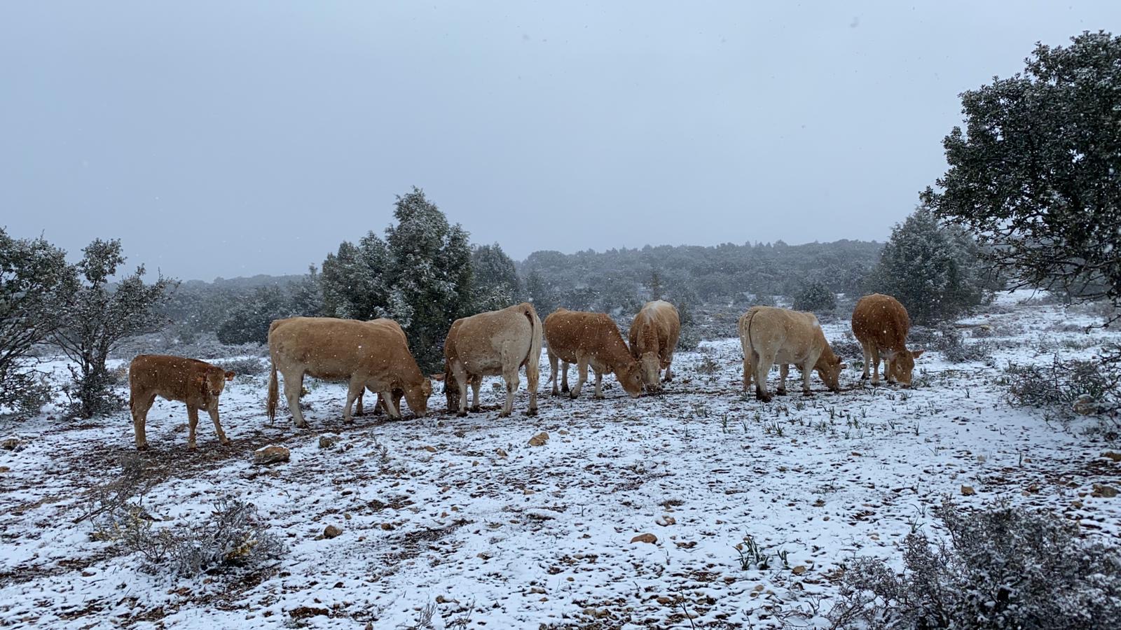 Los ganaderos siguen a pie de campo. Esta foto es de la mañana del 30 de marzo en Liceras, cuando las vacas acababan de recibir el alimento.