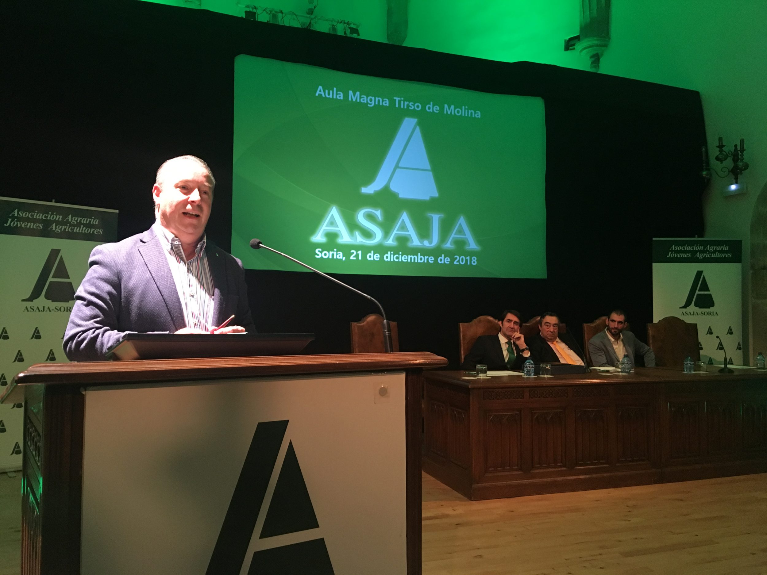 El consejero de Fomento y Medio Ambiente, Juan Carlos Suárez-Quiñones, recibió la mañana del 21 de diciembre el Premio Espiga 2018 de manos del presidente de ASAJA-Soria, Carmelo Gómez, en una sencilla ceremonia dentro de la Asamblea Navideña de la organización profesional agraria en el Aula Magna Tirso de Molina, que estaba abarrotada de profesionales del campo que no querían perderse esta importante cita que cumple 12 ediciones y que ya es un referente para el mundo del agro en la provincia soriana y en toda la región durante las fechas navideñas. La concesión del premio se debe al tesón, esfuerzo y buen trabajo de Suárez-Quiñones. Para los socios de ASAJA Soria, a pesar de dirigir una Consejería que suele ser especialmente incómoda para el sector primario, ha demostrado querer defender la postura de agricultores y ganaderos, algo que en algunas ocasiones le ha costado incluso que las decisiones adoptadas hayan sido llevadas por los ecologistas a los tribunales, en los que para más inri han encontrado respaldo en la figura del Tribunal Superior de Justicia de Castilla y León.