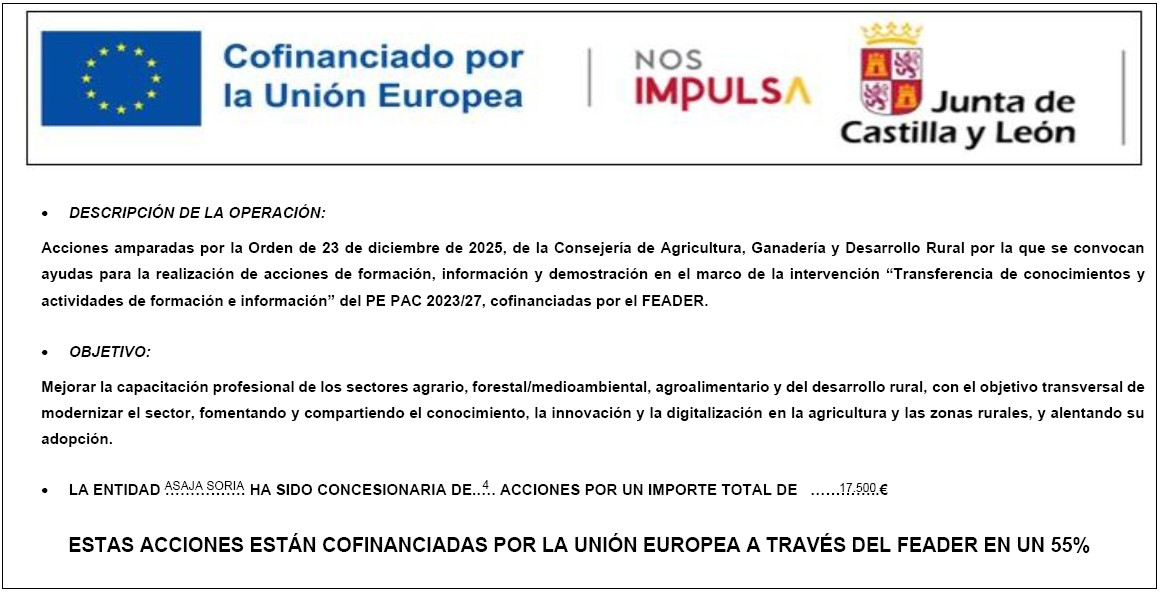 Las acciones formativas están amparadas por la Orden de 23 de diciembre de 2025 por la que se convocan ayudas para la realización de acciones de formación, información y demostración en el marco de la intervención «Transferencia de conocimientos y actividades de formación e información» del Plan Estratégico Nacional de la PAC en España 2023-2027, cofinanciadas por el FEADER y están dirigidas a todos los trabajadores del sector agrario y agroalimentario, y aquellos interesados en incorporarse a estos sectores.