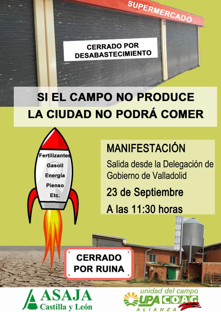 Las organizaciones agrarias ASAJA y la ALIANZA UPA-COAG han convocado una manifestación de protesta por las calles de Valladolid el próximo 23 de septiembre para reclamar soluciones a los altísimos costes de producción que soportan los agricultores y ganaderos, y que ponen en peligro la producción agraria en la presente campaña.